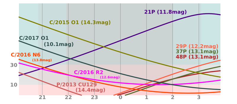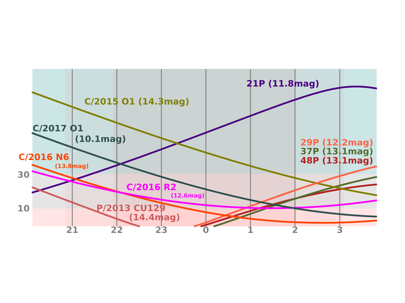 Červen patří tradičně mezi velice slabé měsíce. V období kolem slunovratu nenastává astronomická noc a jasná soumraková obloha pozorování komet znesnadňuje. Na té letošní červnové bude novinkou kometa 21P/Giacobini-Zinner, mateřské těleso meteorického roje Drakonid, který vyprodukoval v letech 1933 a 1946 silný meteorický déšť. Od roku 1900 byla jako jasná kometa pozorována malými dalekohledy již při 15 návratech. Přestože se často přibližuje k Jupiteru, je její dráha poměrně stabilní a vzdálenost v perihelu se drží poblíž 1 AU (v současnosti 1,015 AU). Letošní návrat je nejlepší od roku 1959 a 10. září se přiblíží jen na 0,391 AU k Zemi. V červnu bude rychle zjasňovat z 12,5 na 11 mag a pohodlně ji uvidíme vysoko na obloze v Mléčné dráze v souhvězdí Labutě.