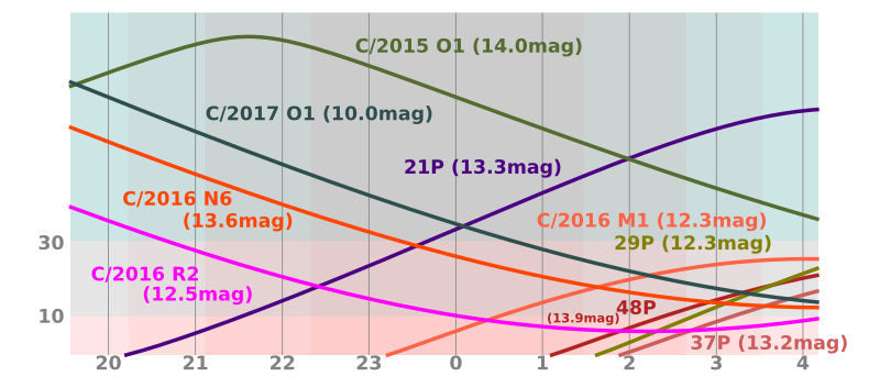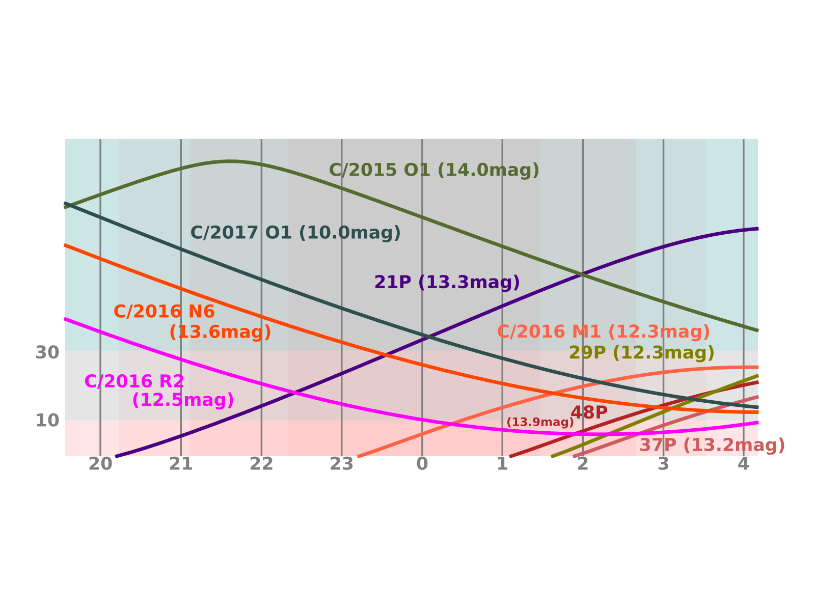 Na květnové obloze se objeví nová jasnější dlouhoperiodická kometa C/2016 M1 (PANSTARRS). Ta bude mírně jasnější 12,5 mag a po půlnoci ji nalezneme jen nízko nad obzorem, a to nejprve v souhvězdí Orla, ze kterého ale rychle přejde do Střelce. Není u Slunce poprvé, předchozí návrat nastal před více než 30 tisíci lety. Slunci se nepřiblíží víc než na 2,211 AU a přestože se jedná o poměrně dost aktivní kometu, podmínky její viditelnosti jsou pro pozorovatele ze severní polokoule velice špatné. V době největší jasnosti (na přelomu června a července) bude hluboko na jižní obloze a od nás nebude pozorovatelná vůbec. Večer, nízko nad obzorem, budeme moci spatřit slábnoucí kometu C/2016 R2 (PANSTARRS) s jasností 12,5 mag. Nalezneme ji v souhvězdí Vozky nedaleko jasné hvězdy Capella.