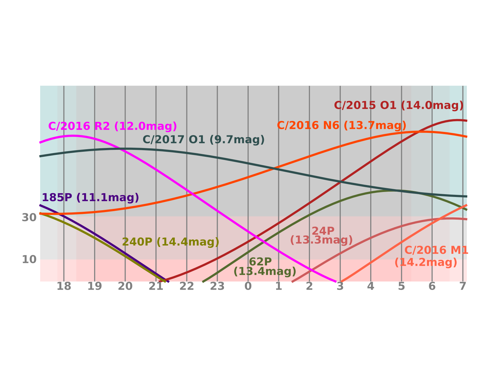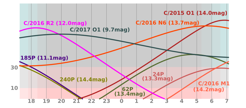 V únoru se počet jasnějších komet na obloze zmenší. Trvalkou oblohy bude C/2016 R2 (PANSTARRS) s jasností okolo 12 mag, kterou nalezneme v souhvězdí Býka poblíž Plejád. Rychle slábnoucí C/2017 O1 (ASASSN) by měla mít jasnost okolo 11,5 mag a pohybovat se bude ze souhvězdí Kefea do Žirafy. Nízko nad obzorem, v souhvězdí Ryb a Velryby, bude možné na večerní obloze spatřit kometu 185P/Petriew s jasností 11 mag.