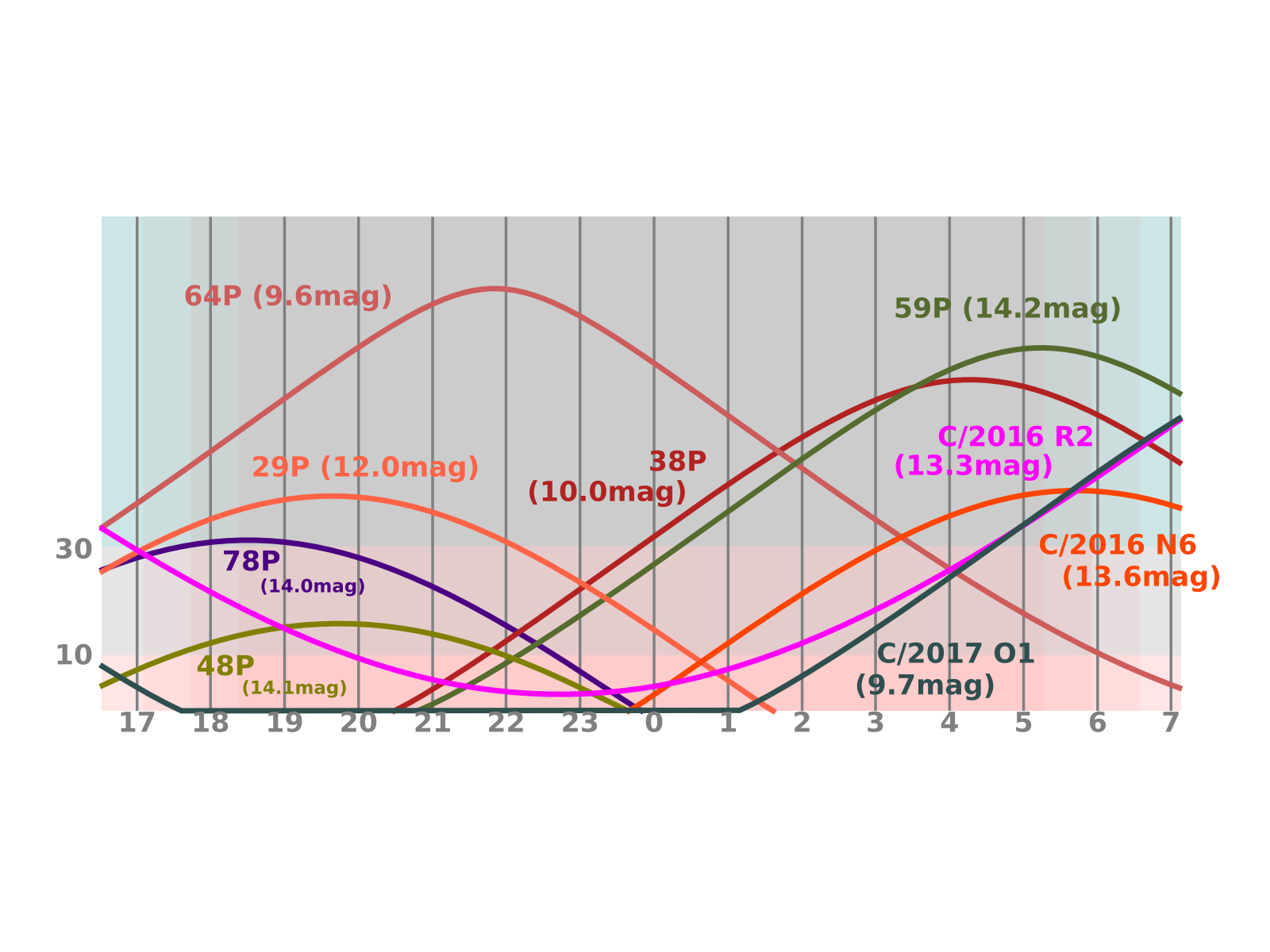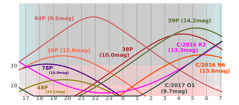 Listopadové obloze by mohla dominovat kometa 64P/Swift-Gehrels, která bude pozorovatelná po celou noc vysoko nad obzorem v souhvězdí Andromedy a pokud opět dojde k jejímu zjasnění v blízkosti perihelu, dosáhne jasnosti okolo 9,5 mag. Maxima jasnosti okolo 10 mag dosáhne také 38P/Stephan-Oterma, která je lépe viditelná ve druhé polovině noci, stále vysoko nad obzorem v Blížencích. Ke konci měsíce se pak dostane na pomezí s Rakem. Kometa 46P/Wirtanen pozorovatelná nebude, nachází se příliš na jihu. Na konci měsíce se sice objeví nad obzorem, bude mít jasnost okolo 5 mag, ale za nautického soumraku bude utopená nízko nad obzorem a její pozorování ještě navíc bude rušit svit Měsíce.