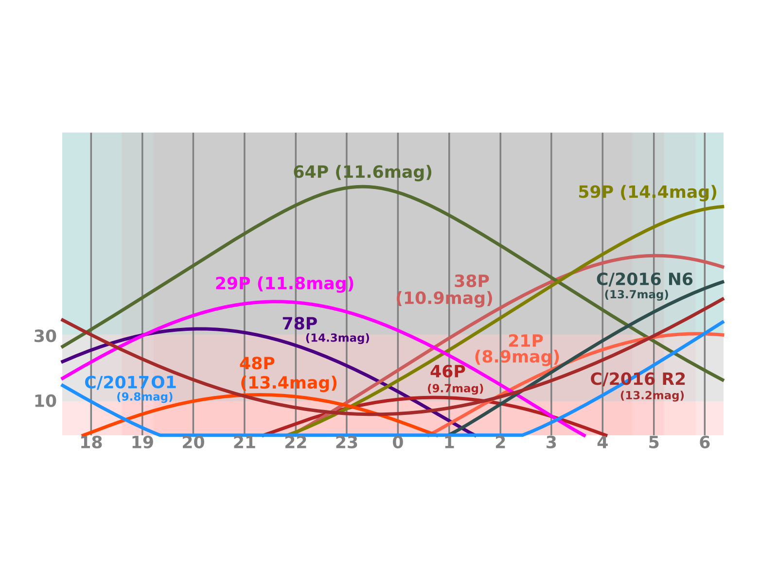 Podmínky viditelnosti 21P/Giacobini-Zinner se po průchodu přísluním začnou výrazně horšit a na konci měsíce se kometa na ranní obloze ztratí u obzoru. Zeslábne z 8 na 9,5 mag a bude se pohybovat ze souhvězdí Jednorožce do Velkého Psa. Výrazně lépe na tom bude 38P/Stephan-Oterma, viditelná v celé druhé polovině noci. Postupně zjasní z 11 na 10 mag a nalezneme ji v souhvězdí Orionu, ze kterého se v polovině měsíce posune do Blíženců. Velice nízko nad obzorem uvidíme kolem půlnoci zjasňující kometu 46P/Wirtanen s jasností kolem 10 mag. Ve druhé polovině měsíce bude hluboko na jižní obloze v souhvězdí Pece prakticky nepozorovatelná. Novinkou na říjnové obloze se stane kometa 64P/Swift-Gehrels s jasností okolo 11,5 mag. Ta bude viditelná po celou noc vysoko nad obzorem v souhvězdí Andromedy. Tato kometa má poměrně stabilní dráhu, vzdálenost v perihelu se pohybuje okolo 1,4 AU (nyní 1,394 AU), přestože se poměrně často přibližuje k Jupiteru. Tato setkání ovšem mění pouze prostorovou orientaci dráhy, nikoliv vzdálenost v perihelu. Současný návrat je dosti příznivý, 28. října se přiblíží k Zemi na 0,445 AU. Podobně příznivý návrat nastane až v roce 2092. U této komety byl pozorován poměrně zajímavý vývoj jasnosti, kdy po průchodu perihelem skokově zjasní až o 1,5 mag a poté pomaleji slábne.