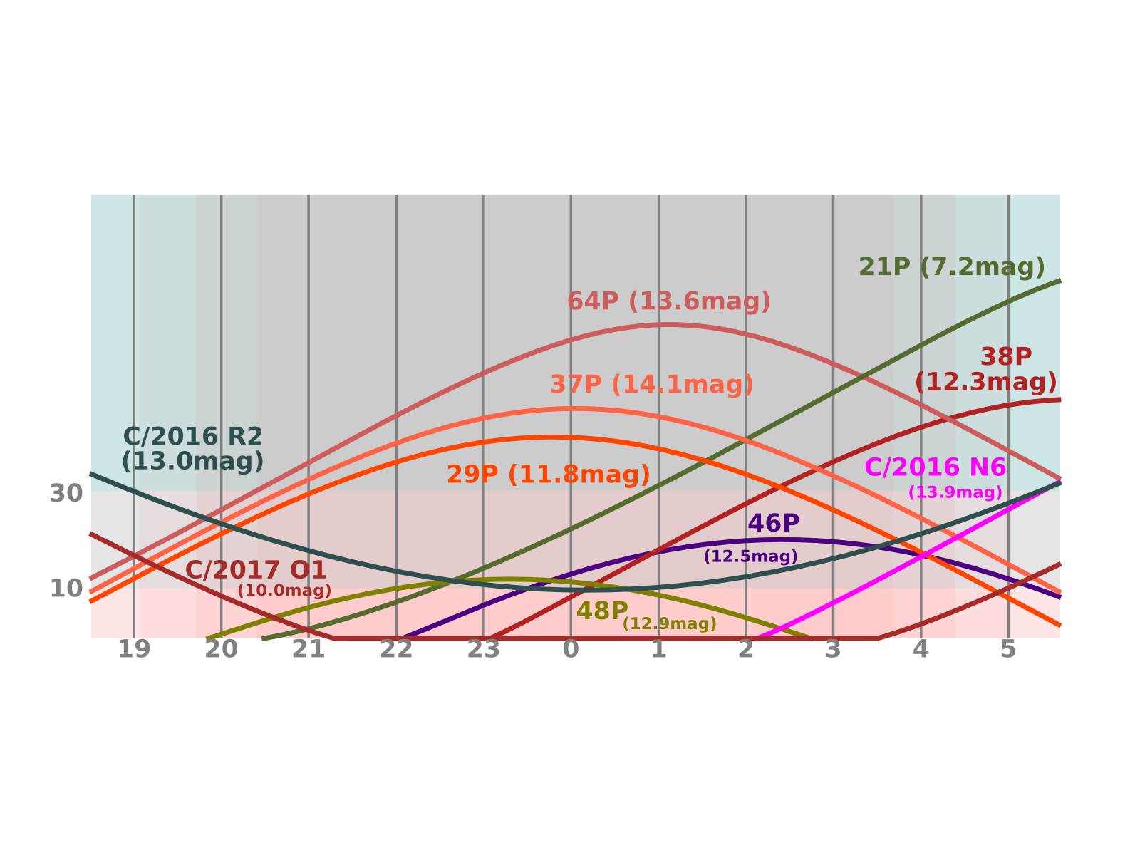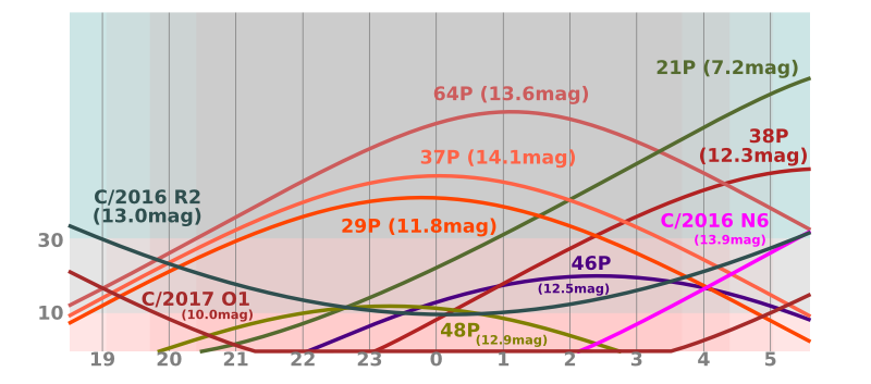 Jen den po novu projde kometa 21P/Giacobini-Zinner perihelem své dráhy a zároveň bude nejblíže Zemi, pouhých 0,391 AU. V tomto měsíci dosáhne maxima jasnosti (okolo 7,2 mag) a bude stále na ranní obloze vysoko nad obzorem. Její pohyb po obloze se výrazně zrychlí, v prvních dnech září ji nalezneme ve Vozkovi, v polovině měsíce přejde do Blíženců poblíž hraniční oblasti s Býkem a Orionem, na konci měsíce pak vstoupí do souhvězdí Jednorožce. Na obloze se také objeví krátkoperiodická kometa 38P/Stephan-Oterma s nezvykle dlouhou periodou 37,71 let. Ta se k Jupiteru moc nepřibližuje a má tak dosti stabilní dráhu s přísluním aktuálně 1,588 AU. Letošní návrat je poměrně příznivý, v prosinci bude jen 0,765 AU od Země a bude mírně jasnější 10 mag. K dobré pozorovatelnosti přispěje i její výška na obloze. V září bude rychle zjasňovat z 12,5 na 11 mag a nalezneme ji v souhvězdí Orionu. Pozorovatelná bude i kometa 46P/Wirtanen, která by mohla být vidět v prosinci pouhým okem. V polovině září by měla dosáhnout jasnosti 12,5 mag, na konci měsíce zjasní k 11 mag a bude se pohybovat z Velryby do souhvězdí Pece. Tato kometa se měla původně stát cílem sondy Rosetta, ale zpoždění v přípravě projektu způsobila, že se startovací okno uzavřelo a musel být zvolen náhradní cíl – kometa 67P/Čurjumov-Gerasimenko. Kometa Wirtanen byla pro misi zvolena proto, že se jedná o velice zajímavé těleso – mladou kometu s nezvykle strmým růstem i poklesem jasnosti. Dráha komety se díky přiblížení k Jupiteru vyvíjí dost chaoticky. V době objevu, v roce 1948, se vzdálenost od Slunce v perihelu pohybovala nad hodnotou 1,6 AU, přiblížení k Jupiteru v letech 1972 a 1984 ji postupně snížilo na 1,3, resp. 1,1 AU a na této hodnotě se drží dodnes (aktuálně 1,055 AU). Díky tomu se kometa stala viditelnou i triedry a při všech pěti posledních návratech byla viditelná jako objekt mezi 8 až 10 mag. Situace se ale změní po roce 2040, kdy se začne perihel posouvat dál od Slunce a okno, kdy bude možné tuto kometu pozorovat malými dalekohledy, se tak opět uzavře. Letošní návrat je zatím vůbec nejpříznivější a nemá v historii pozorování této komety obdoby. Dne 16. prosince projde jen 0,078 AU od Země. Její jasnost by měla dosáhnout jasnosti 3,4 mag a kometa by tedy měla být viditelná pouhým okem.