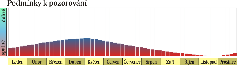 V červenci se viditelnost Jupiteru posouvá do první poloviny noci a v srpnu na večerní oblohu. V září už je pozorovatelný jen večer nízko nad západním obzorem, do poloviny října se z oblohy vytratí. V listopadu a po většinu prosince je pak Jupiter nepozorovatelný. Konjunkce se Sluncem nastává 26. 11. v 8 h SEČ, o dva dny dříve, 24. 11. v 5 h SEČ, dělí Jupiter od Země největší vzdálenost (6,347 AU).
