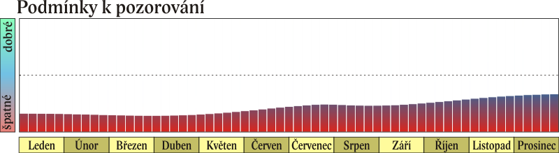 Období viditelnosti po celou noc je krátké. Trvá od poloviny července do konce první srpnové dekády. Opozice nastává 27. 7. v 6 h SEČ, v nejmenší vzdálenosti od Země (0,385 AU) se Mars ocitá 31. 7. v 9 h SEČ. Planeta v době opozice kulminuje o půlnoci pouhých 14,5° nad jižním obzorem. Jasnost Marsu dosáhne -2,8 mag a zdánlivý průměr kotoučku přesáhne 24".