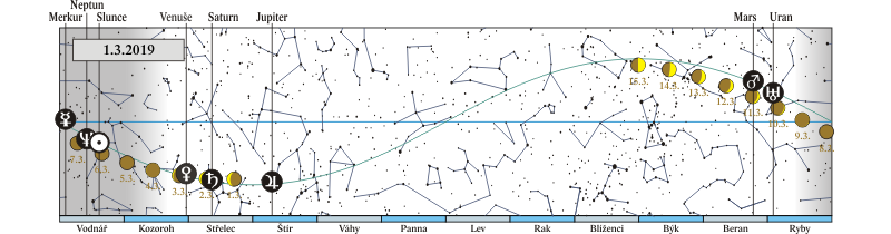 Měsíc v konjunkci s Venuší (Venuše 1,67° severně; 2. a 3. 3. ráno seskupení Saturnu, Měsíce, Venuše a Jupiteru nad JV obzorem) |