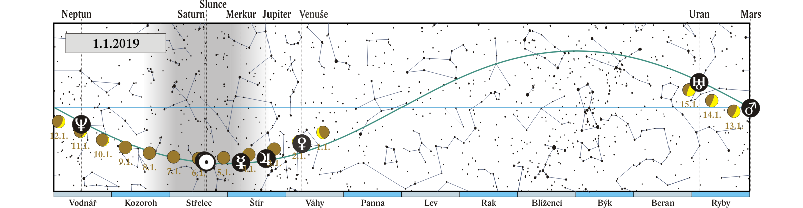 Měsíc v konjunkci s Marsem (Mars 5,48° severně; Měsíc v blízkosti Marsu na večerní obloze 12. a 13. 1.) |