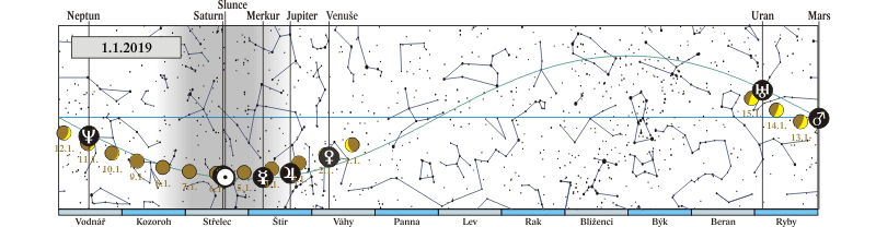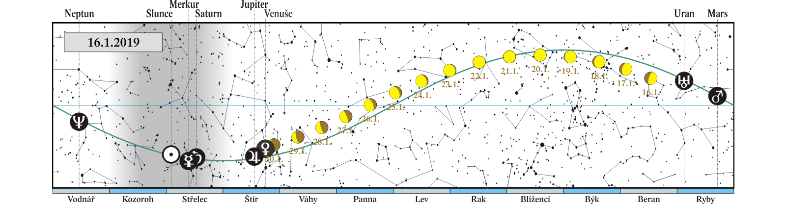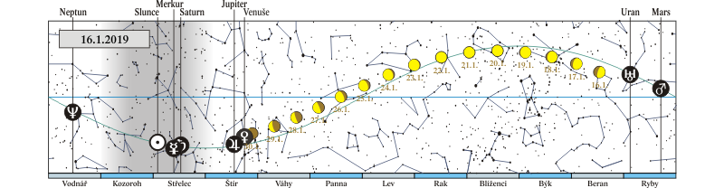 Měsíc v konjunkci s α Vir (Spica 7,18° jižně; Měsíc v blízkosti Spiky pozorovatelný 27. 1. po půlnoci) |