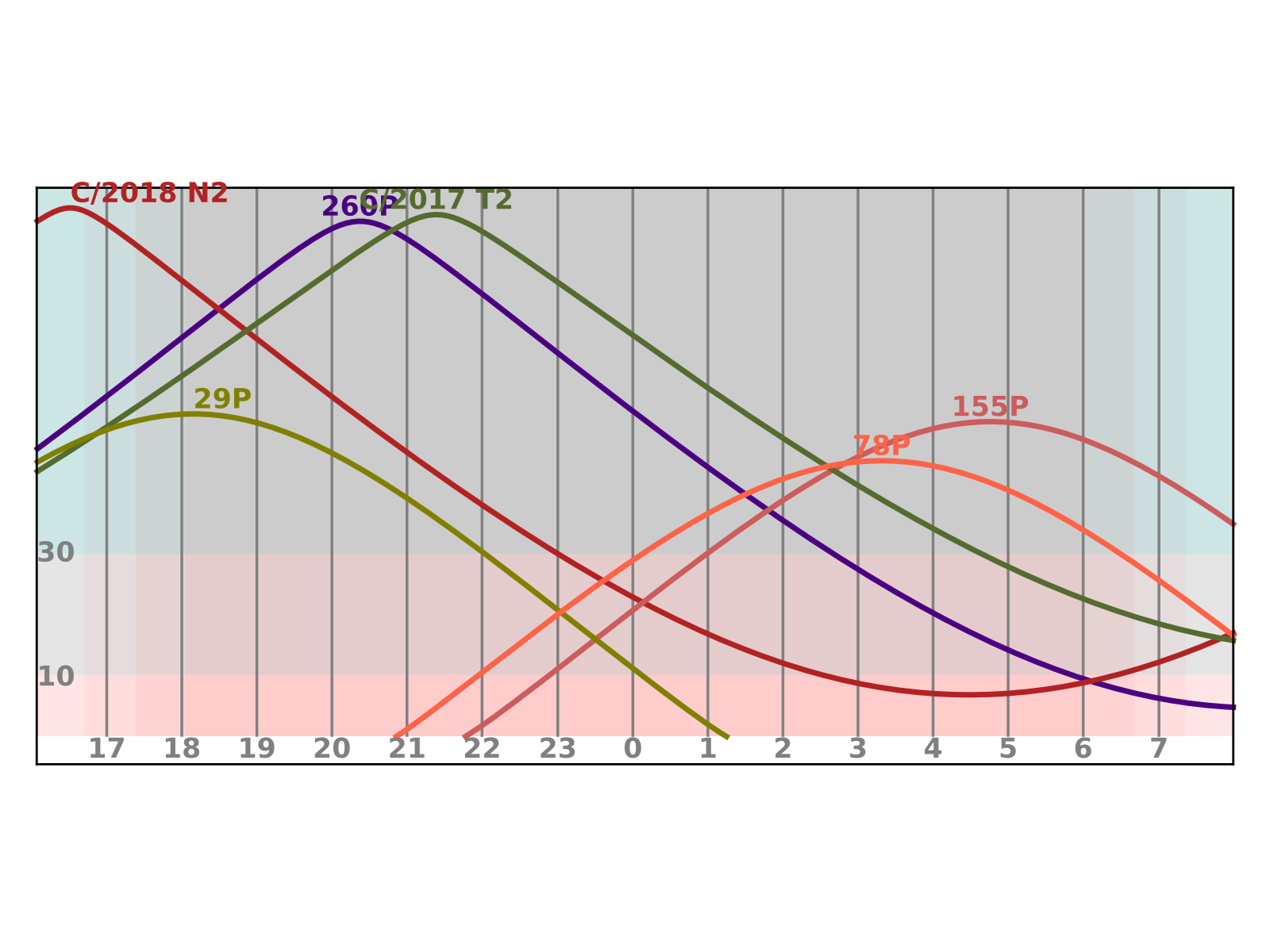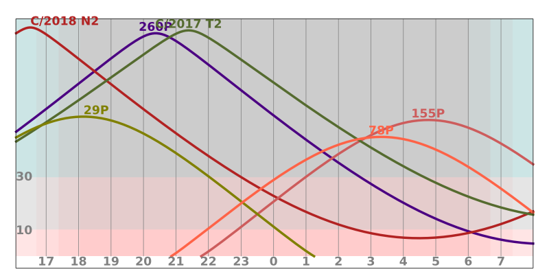 V dosahu malých binokulárů by se měla s jasností okolo 9 mag ocitnout C/2017 T2 (PANSTARRS). Stále bude v ideální poloze na obloze téměř v nadhlavníku. Nalezneme ji v Perseovi v blízkosti hranice se Žirafou, do níž se přesune na konci roku.