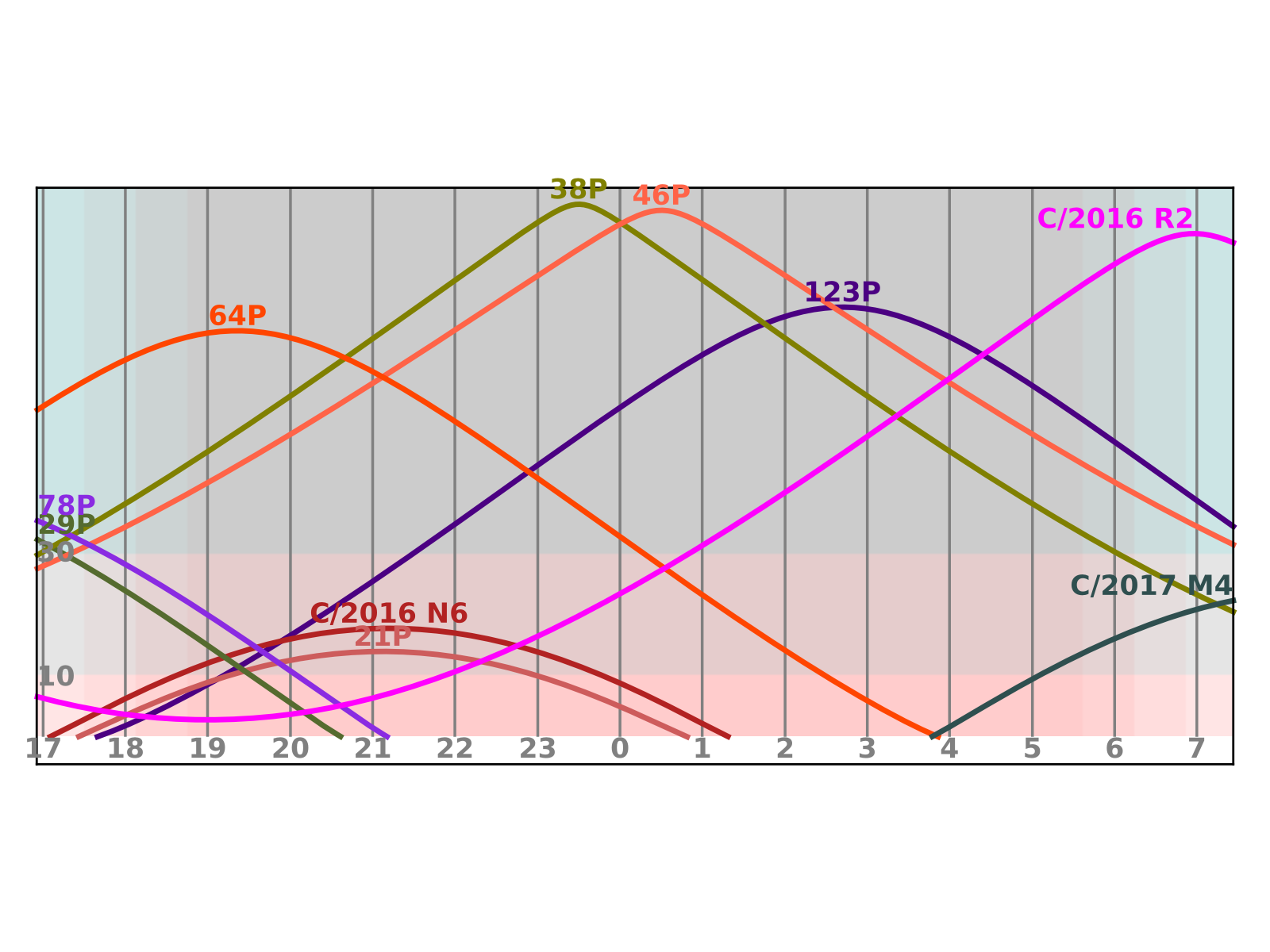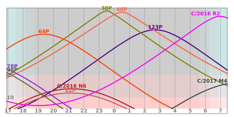 Komety loňského roku výrazně zeslábnou. V dosahu binokulárů by ale stále měla být 46P/Wirtanen s jasností kolem 8 mag. Pohybovat se bude souhvězdím Velké medvědice. Ještě než na dlouhých 38 let zmizí v chladných končinách sluneční soustavy, budeme moci pozorovat kometu 38P/Stephan-Oterma. Tak dlouhá perioda není mezi krátkoperiodickými kometami obvyklá. Nalezneme ji stále v souhvězdí Rysa a její jasnost poklesne na 12,5 mag.