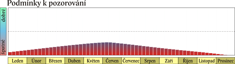 V červnu je Jupiter nad naším obzorem po celou noc, v opozici se ocitá 10. 6. v 16 h SEČ. O dva dny později, 12. 6. ve 4 h SEČ, je Jupiter v nejmenší vzdálenosti od Země (4,284 AU). Planeta v období opozice dosahuje jasnosti -2,6 mag a kulminuje o půlnoci ve výšce pouhých 17,5° nad jižním obzorem.