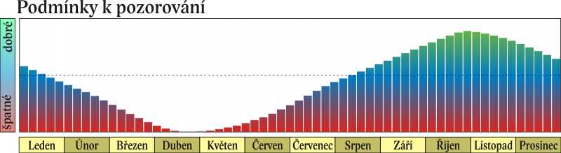 Na začátku roku je Uran pozorovatelný v první polovině noci, na konci astronomického soumraku se nachází ve výšce necelých 49° nad jižním obzorem. V únoru najdeme Uran večer vysoko na jihozápadě a západě nedaleko Marsu. Při vzájemné konjunkci, která nastává 13. 2. v 7 h SEČ, se planety přiblíží na 0,98°. Do poloviny března je pak Uran pozorovatelný večer nad západním obzorem.