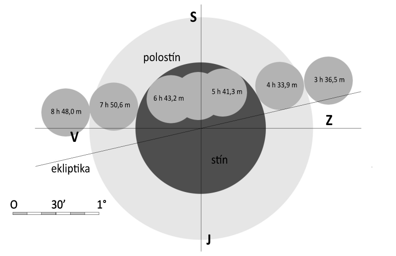 Velikost zatmění v největší fázi dosáhne hodnoty 1,1953 (v jednotkách měsíčního průměru). Podrobněji je průběh zatmění popsán v tabulce níže, kde jsou kromě časů jednotlivých okamžiků zatmění uvedeny rovněž i jejich poziční úhly.