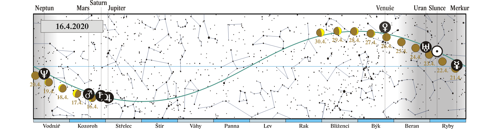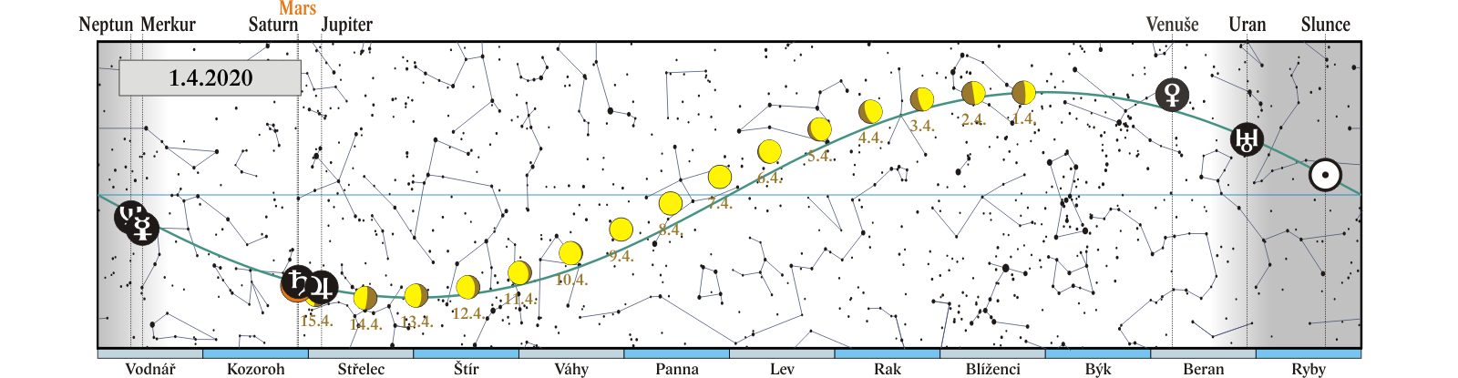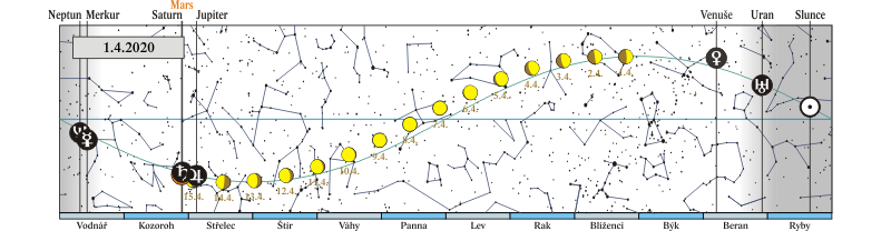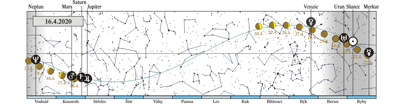 Měsíc v konjunkci se Saturnem (Saturn 3,0° severně; Měsíc, Jupiter, Saturn a Mars 15. a 16. 4. ráno) |