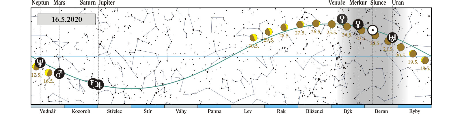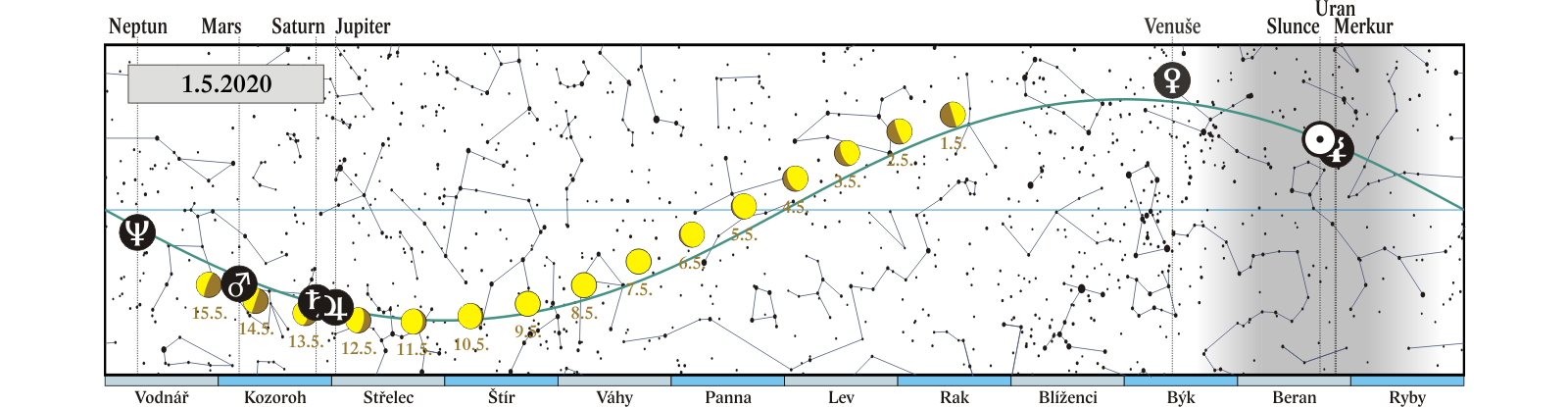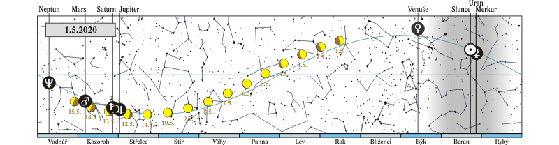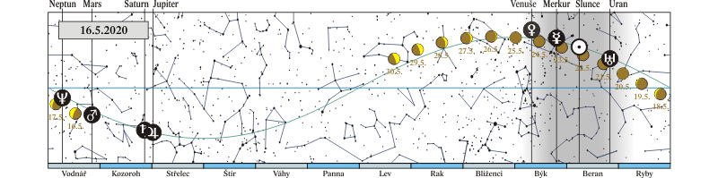 Měsíc v konjunkci s Jupiterem (Jupiter 2,7° severně; Měsíc, Jupiter a Saturn 12. a 13. 5. ve druhé polovině noci) |