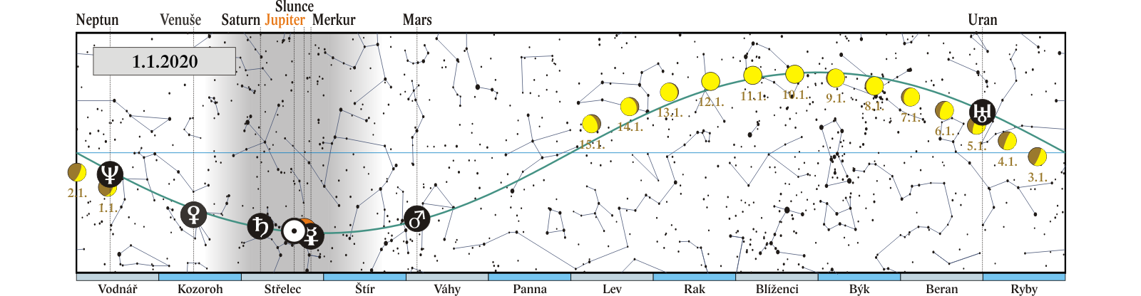 Měsíc v konjunkci s α Leo (Regulus 2,88° jižně; Měsíc u Regulu 12. a 13. 1. večer) |