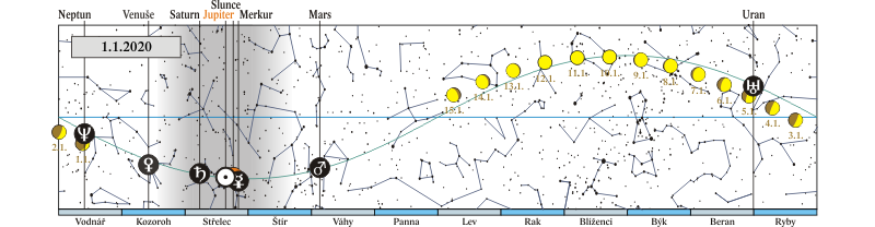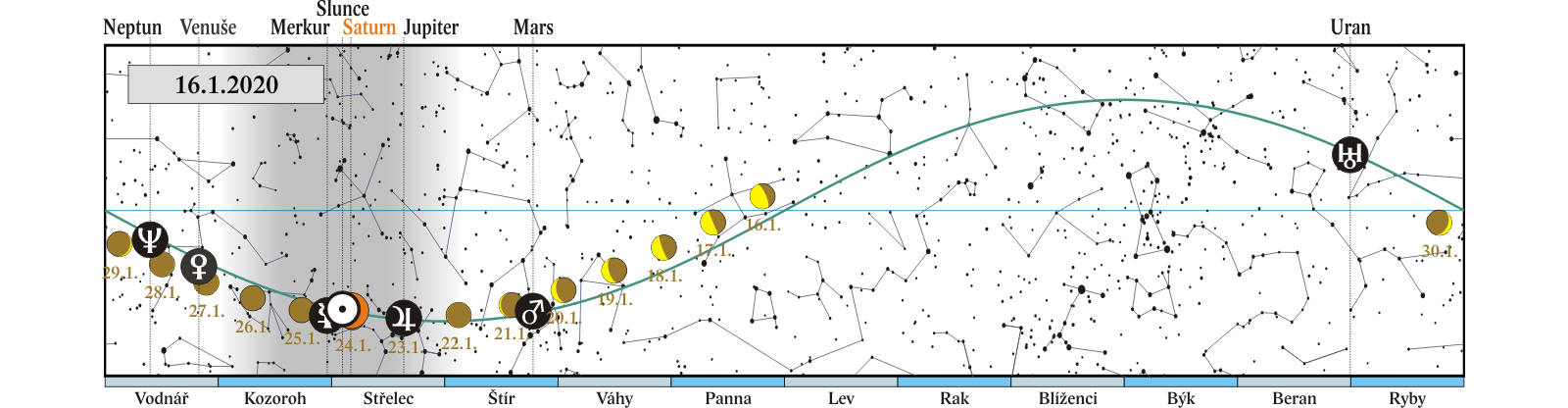 Měsíc v konjunkci s α Sco (Antares 6,54° jižně; Měsíc, Mars a Antares 20. a 21. 1. ráno na JV) |