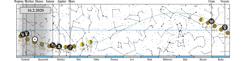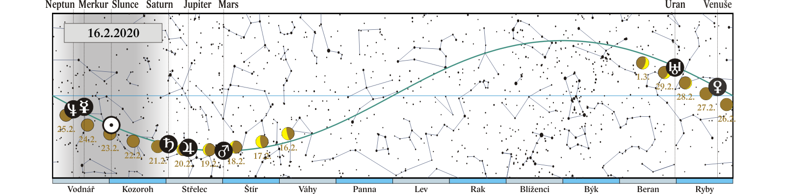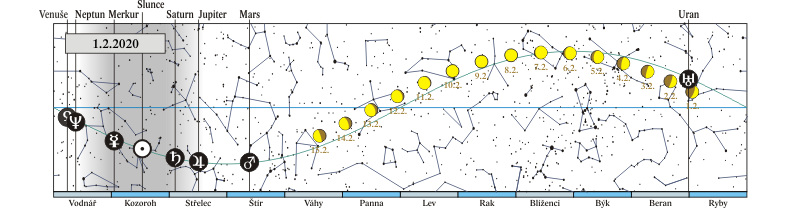 Měsíc v konjunkci s α Vir (Spica 6,62° jižně; Měsíc u Spiky 13. a 14. 2. ráno) |