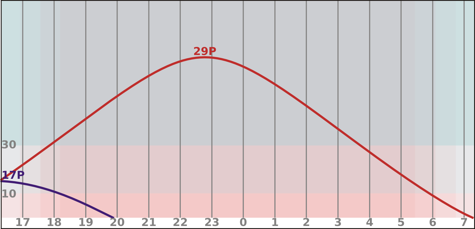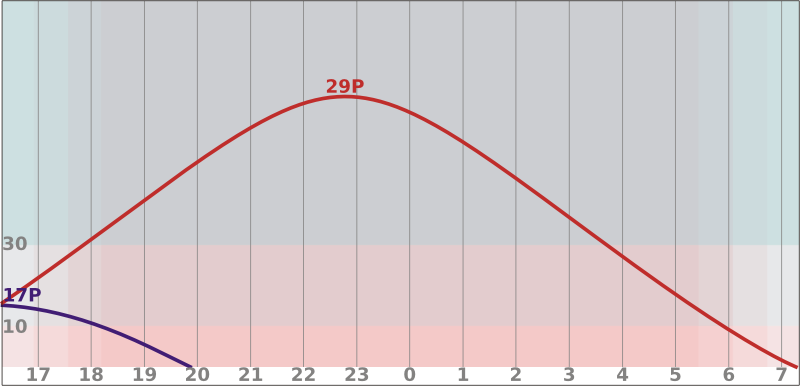 V listopadu nastane zajímavá situace. Na obloze se opět objeví dvě komety jasnější 14 mag a budou se nacházet velice blízko sebe. Proto je na diagramu vyobrazena pouze jedna. Jedna z nich je kometa 88P/Howell s jasností okolo 10 mag a druhá, podstatně slabší, 17P/Holmes je jen mírně jasnější 14 mag. Obě komety se budou pohybovat souhvězdím Střelce, ze kterého se ke konci měsíce přesunou do Kozoroha. 29P/Schwassmann-Wachmann bude nejlépe vidět před půlnocí.