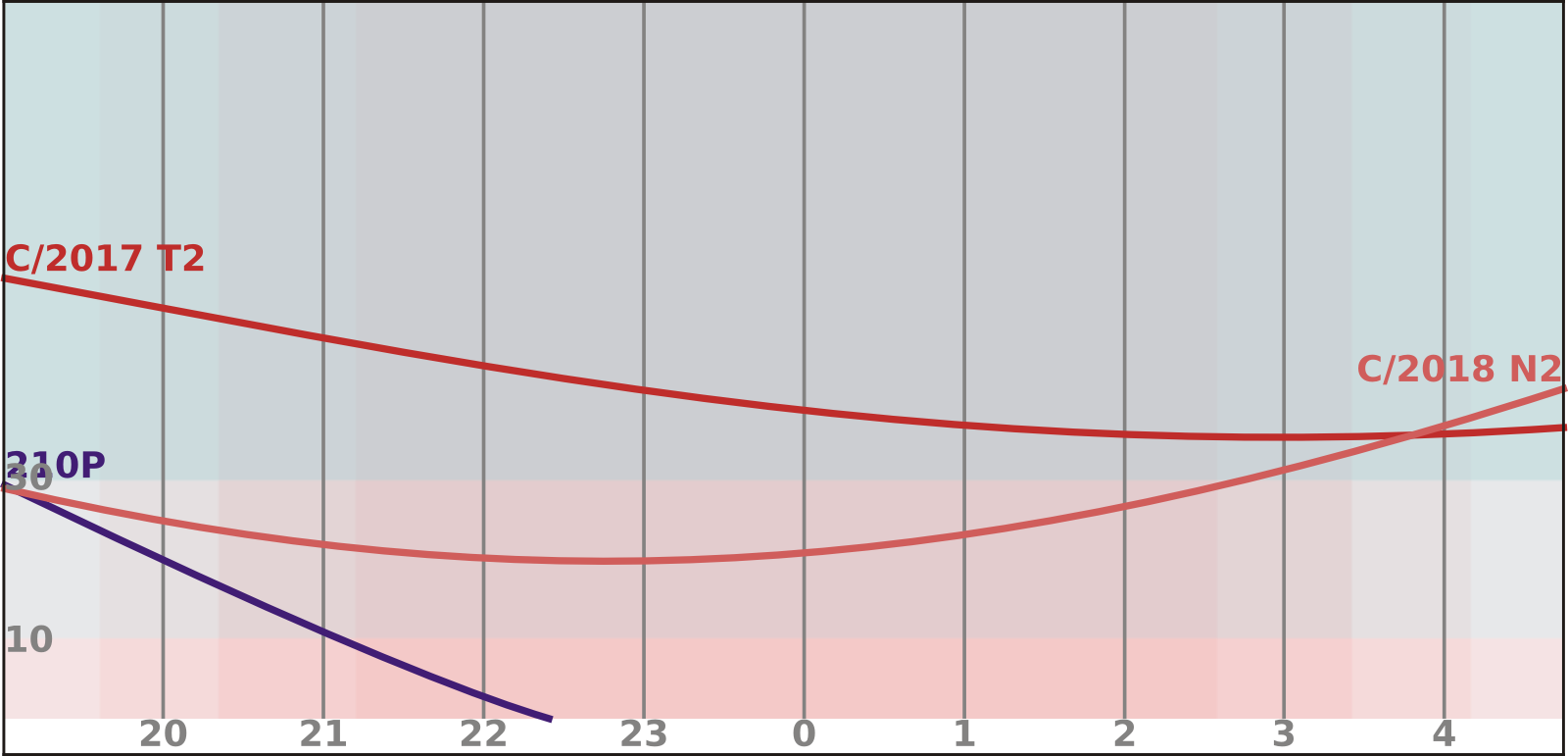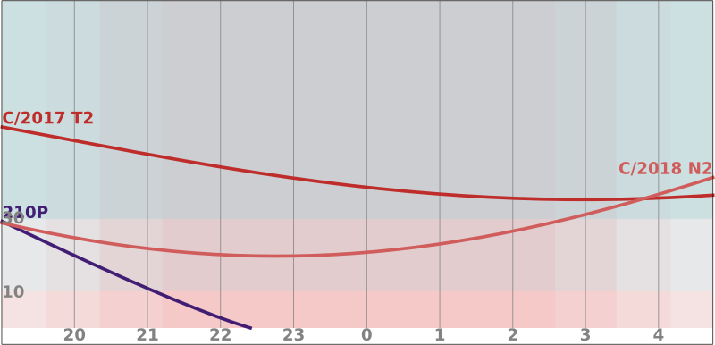 Výborné pozorovací podmínky komety C/2017 T2 (PANSTARRS) budou pokračovat, navíc dosáhne maxima jasnosti kolem 9 mag. Z Kasiopeji se přesune do Žirafy, kde zrychlí pohyb. V této lunaci bude krátce pozorovatelná komety 210P/Christensen. Kometu nalezneme večer jako objekt 12,5 mag jen asi 10° nad obzorem. Bude se pohybovat velmi rychle souhvězdím Býka. Kometa C/2018 N2 (ASASSN) se přesune na ranní oblohu, kde ji nalezneme v souhvězdí Kasiopeji jako objekt 13,5 mag.