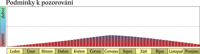 Během jara se viditelnost Jupiteru postupně zlepšuje. Na konci března se počátkem občanského soumraku nachází ve výšce 14° nad JV obzorem, koncem dubna už je na začátku občanského soumraku 17° nad JJV obzorem.