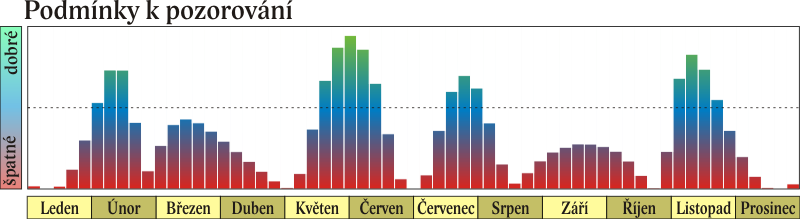 Následuje dolní konjunkce se Sluncem 26. 2. ve 3 h a největší západní elongace (28°) dne 24. 3. ve 3 h, při níž je Merkur nepozorovatelný. Po horní konjunkci se Sluncem 4. 5. ve 23 h následuje při největší východní elongaci (24°), k níž dojde 4. 6. ve 14 h, druhé období viditelnosti Merkuru na večerní obloze. Okolo 18. května se koncem občanského soumraku objeví 5° nad SZ obzorem, jasnost má okolo -1,0 mag. Dne 22. 5. v 10 h nastává konjunkce (0,88°) s Venuší. Dne 9. 6. klesne jasnost Merkuru na +1,0 mag, na konci občanského soumraku se ztrácí v červáncích 7° nad SZ obzorem.