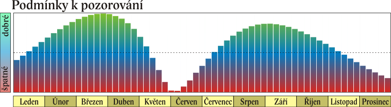 Během května se viditelnost planety prudce zhoršuje – zkracuje se noc a blíží se dolní konjunkce se Sluncem. V polovině května je Venuše na konci občanského soumraku ve výšce 13° nad SZ obzorem. Dne 22. 5. v 10 h dojde ke konjunkci Venuše s Merkurem. My planety uvidíme večer, na konci občanského soumraku budou 8° nad SZ obzorem.