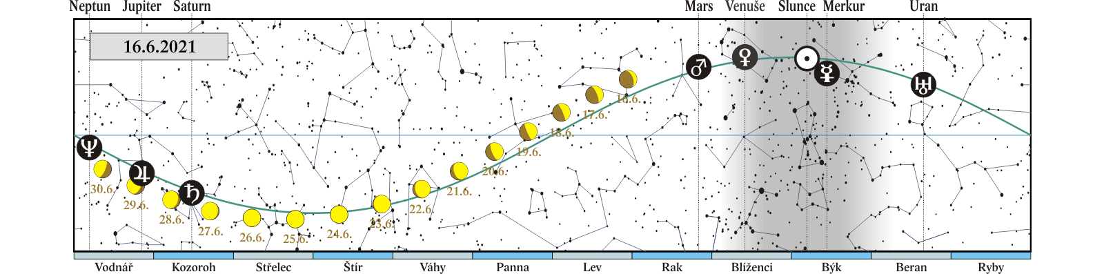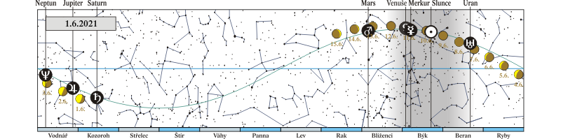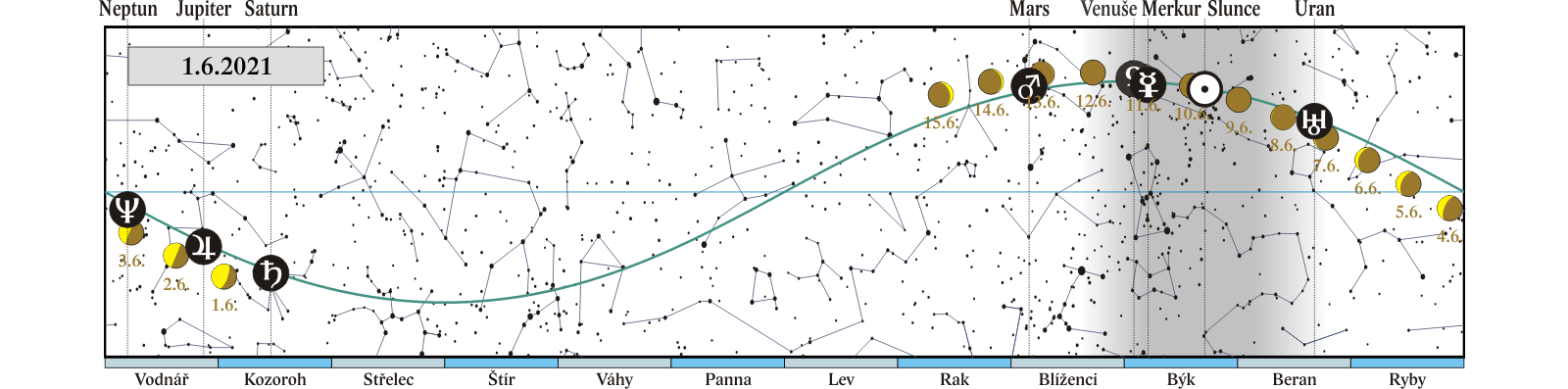 Měsíc v konjunkci s Venuší (Venuše 0,8° jižně; večer 12. a 13. 6. Měsíc, Venuše a Mars) |