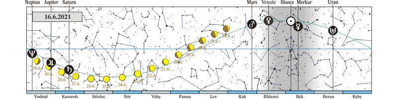 Měsíc v konjunkci se Saturnem (Saturn 4,3° severně; 27. až 29. 6. ráno Měsíc, Saturn a Jupiter) |