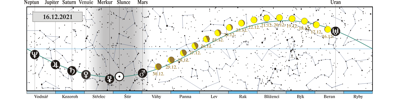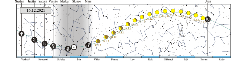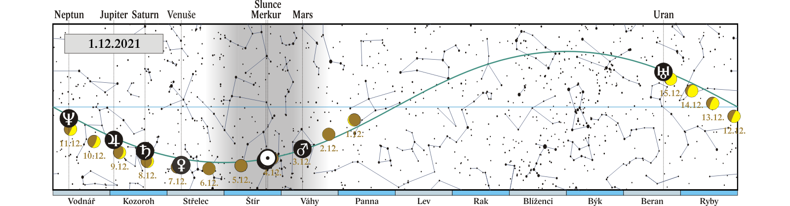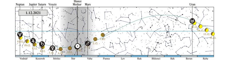 Měsíc v konjunkci s Venuší (Venuše 2,3° severně; 6. až 9. 12. večer Měsíc, Venuše, Saturn a Jupiter) |