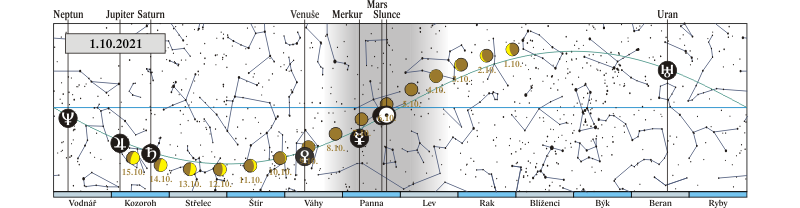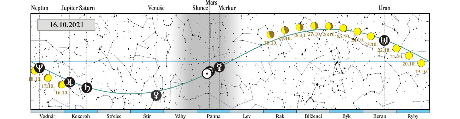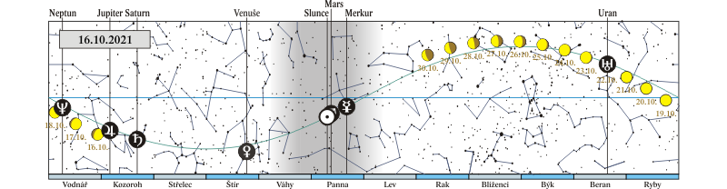 Měsíc v konjunkci se Saturnem (Saturn 4,4° severně; 14. a 15. 10. večer na J a JZ Měsíc, Saturn a Jupiter) |