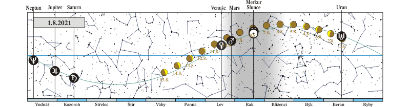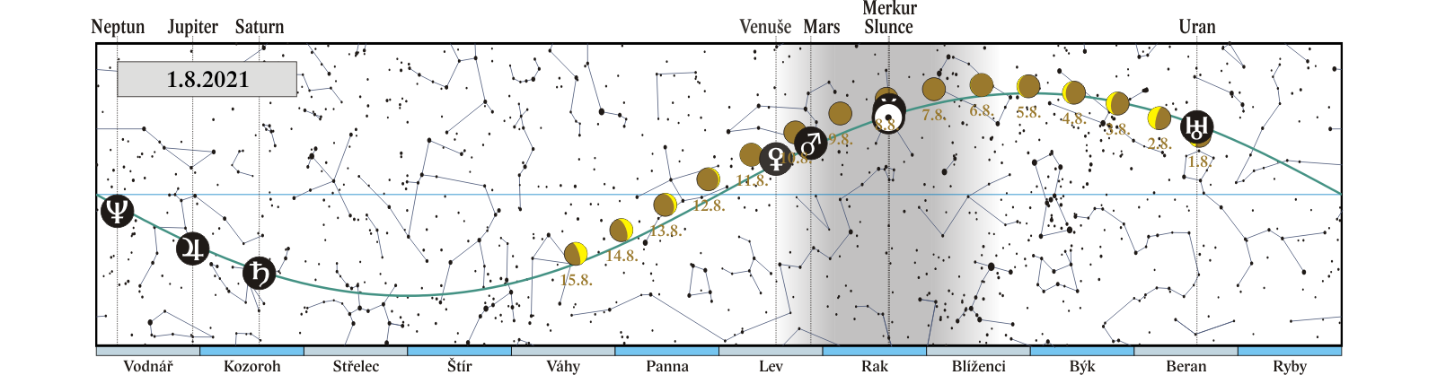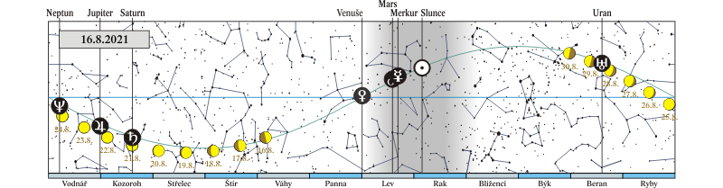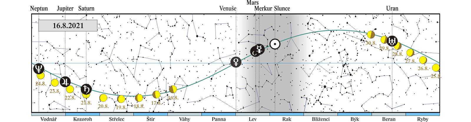 Měsíc v konjunkci se Saturnem (Saturn 4,3° severně; 20. až 22. 8. po celou noc Měsíc, Saturn a Jupiter) |