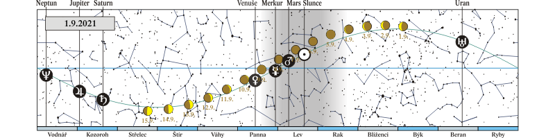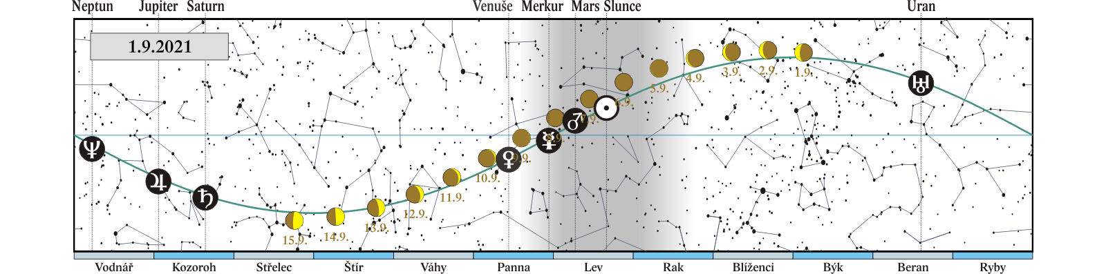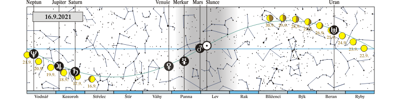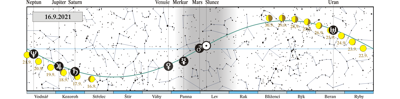 Měsíc v konjunkci se Saturnem (Saturn 4,1° severně; 16. až 18. 9. po celou noc Měsíc, Saturn a Jupiter) |