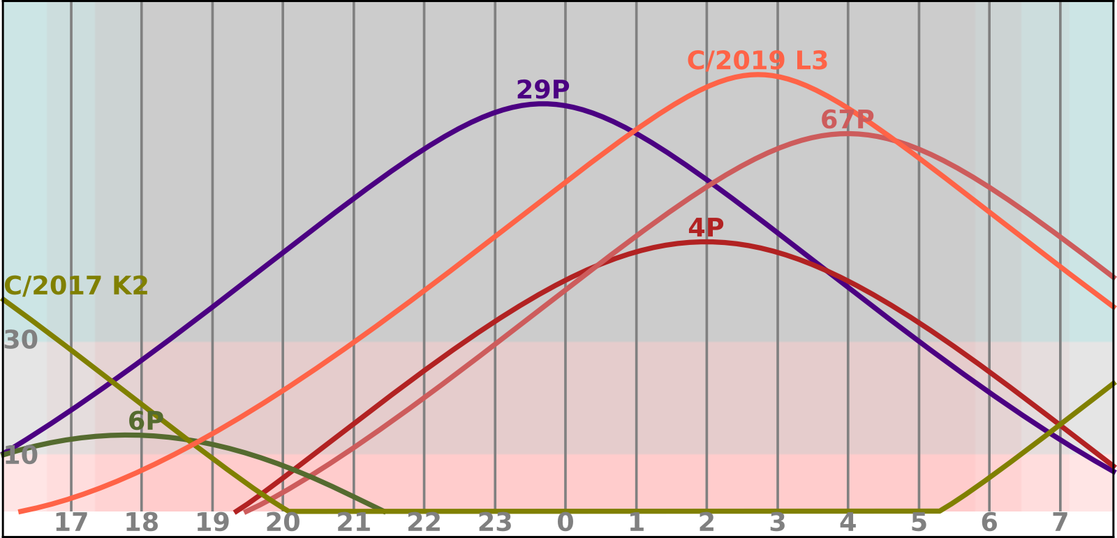 Večer můžeme s obtížemi spatřit 6P/d'Arrest, bude jenvelice nízko nad obzorem v souhvězdí Jižní Ryby s jasností 11,5 mag. I C/2017 K2 (PANSTARRS) už bude obtížně pozorovatelná narozhraní Herkula a Hadonoše s jasností 12 mag. Celou noc bude pozorovatelná 29P/Schwassmann-Wachmann na rozhraní Vozky a Persea. Stálev maximu jasnosti kolem 9,5 mag uvidíme 67P/ Čurjumov -Gerasimenko, nyní již po většinu noci v souhvězdí Raka. Kometa 11,5 mag, 4P/Faye, bude v Jednorožci. Stejnou jasnost bude mít C/2019 L3 (ATLAS), kterou najdeme v souhvězdí Rysa na pomezí s Blíženci a Vozkou.