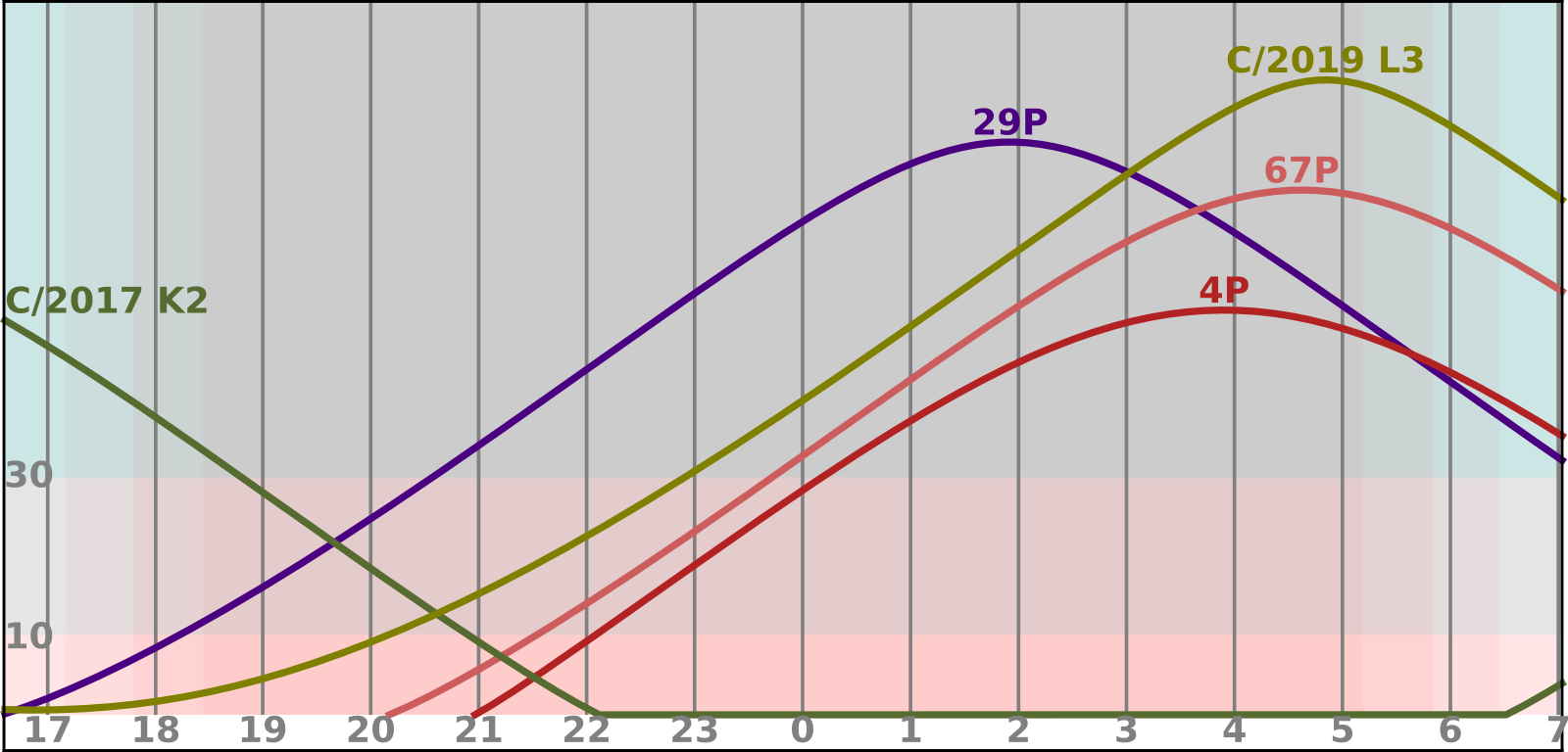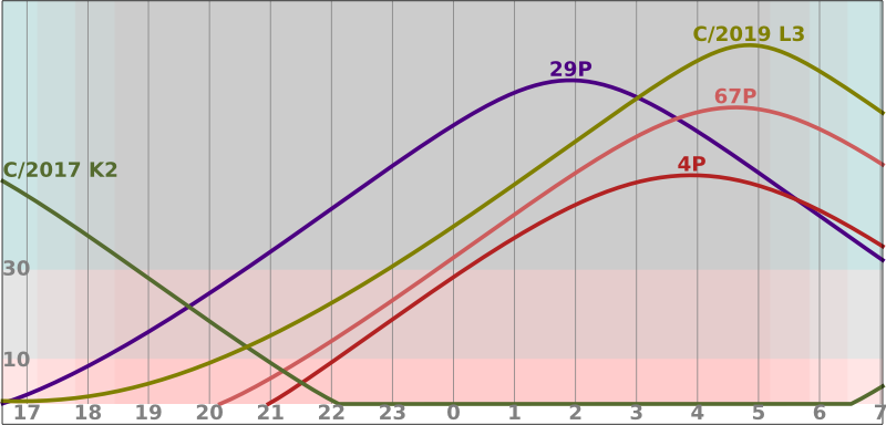 Tomuto období bude dominovat 67P/ Čurjumov -Gerasimenko v maximu jasnosti kolem 9 mag. Nalezneme ji v Blížencích. S jasností kolem 11,5 mag pak můžeme pozorovat 4P/Faye na rozhraní Jednorožce s Blíženci a v Rysovi C/2019 L3 (ATLAS). Ve Vozkovi bude 29P/Schwassmann-Wachmann. Večer můžeme stále spatřit C/2017 K2 (PANSTARRS) v Herkulovi s jasností 12,5 mag.