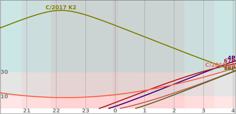 C/2017 K2 (PANSTARRS) bude jedinou kometou viditelnou večer, nalezneme ji v Herkulovi a její jasnost se bude pohybovat kolem 13 mag. Se stejnou jasností uvidíme veVozkovi (nejlépe ráno) stále cirkumpolárníC/2019 L3 (ATLAS). Na ranní obloze se objeví jasná kometa 15P/Finlay, s jasností 9,5 ji nalezneme na rozhraní Býka aBerana. V Beranovi pak spatříme s jasností 12,5 mag4P/Faye a v Býku opět 29P/Schwassmann-Wachmann. Na rozhraní Velryby a Ryb bude možné pozorovat 67P/ Čurjumov -Gerasimenko (jasnost 14 mag).