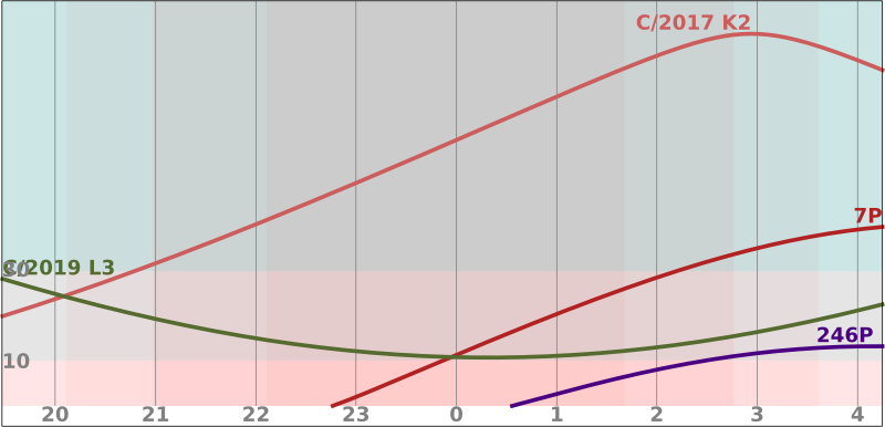 Nejjasnější kometou v tomto období bude 7P/Pons-Winnecke sjasností kolem 11 mag ji nalezneme ráno v Orlu. C/2017 K2 (PANSTARRS) bude pozorovatelná celou noc, s jasností 13,5 se bude nacházet na rozhraní Lyry a Herkula. Stejně jasná bude C/2019 L3 (ATLAS) a pozorovatelná je v Perseovi jen nízko nad obzorem.