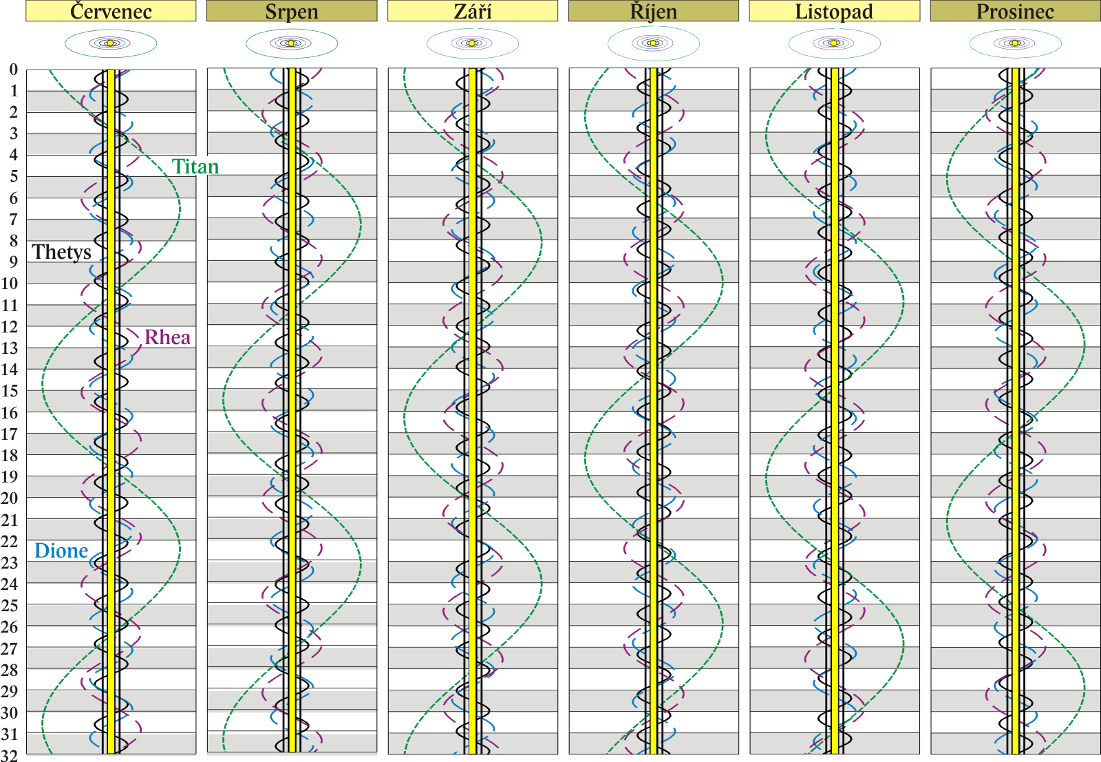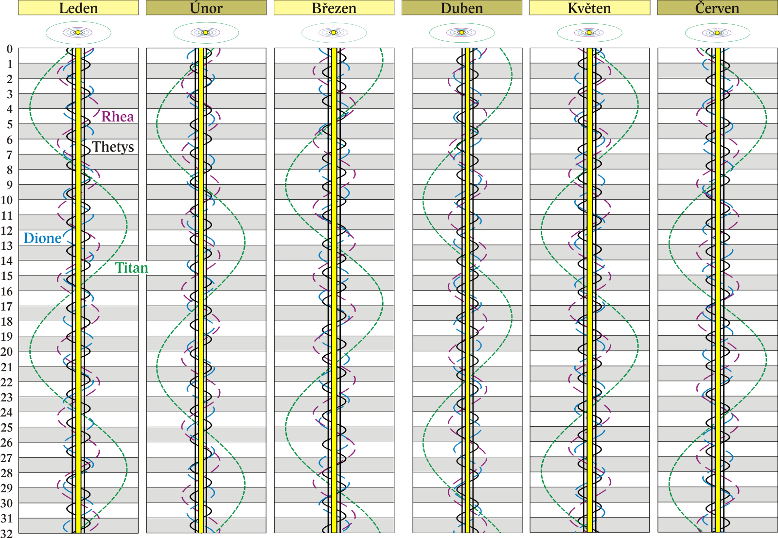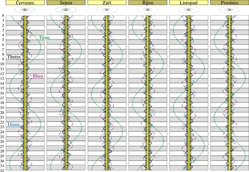 Grafy poloh čtyř největších měsíců Saturna.