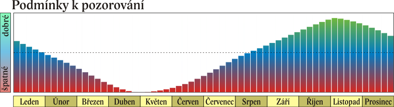 Koncem prosince je Uran na konci astronomického soumraku ve výšce 49° nad jihovýchodním obzorem, vrcholí před dvacátou hodinou a zapadá krátce po třetí hodině ranní.