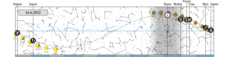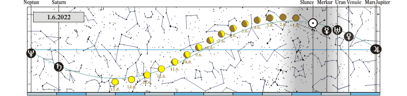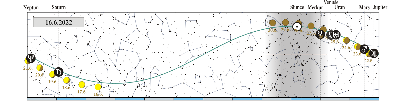 Měsíc v konjunkci s Jupiterem (Jupiter 3,00° severně; 21. až 23. 6. seskupení Měsíce, Jupiteru a Marsu ráno nad východním a jihovýchodním obzorem) |