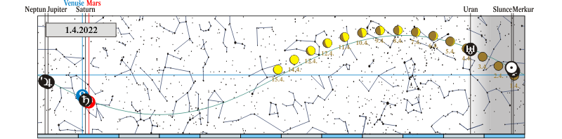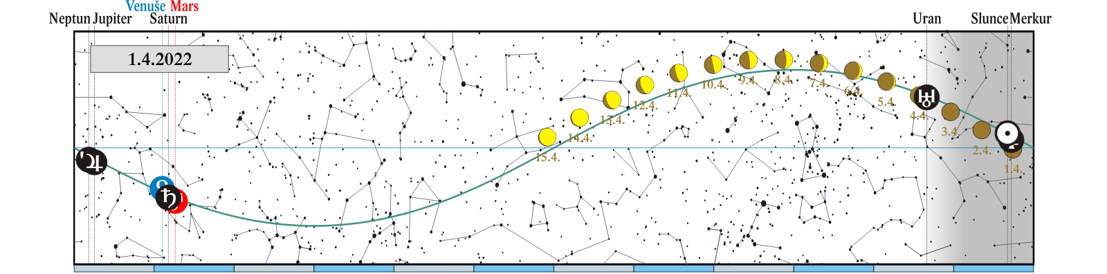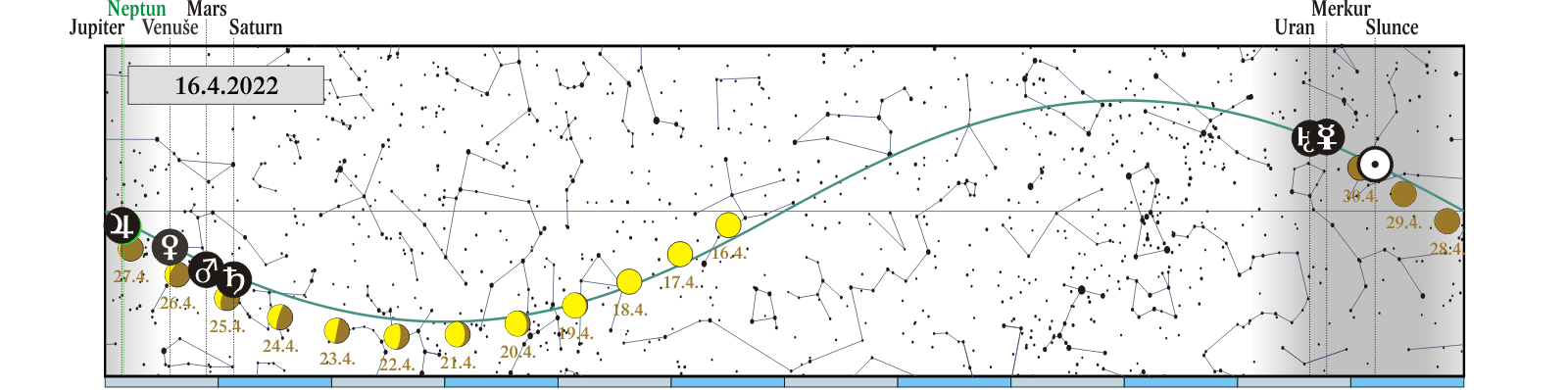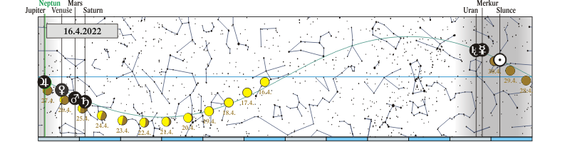 Měsíc v konjunkci se Saturnem (Saturn 5,02° severně; od 24. do 28. 4. Měsíc ráno postupně prochází okolo seskupení Saturnu, Marsu, Venuše a Jupiteru) |