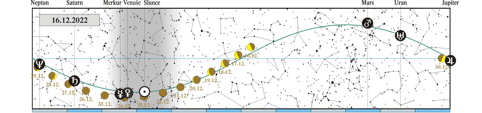 zimní slunovrat, začátek astronomické zimy (22:48), Slunce vstupuje do znamení Kozoroha |