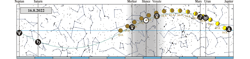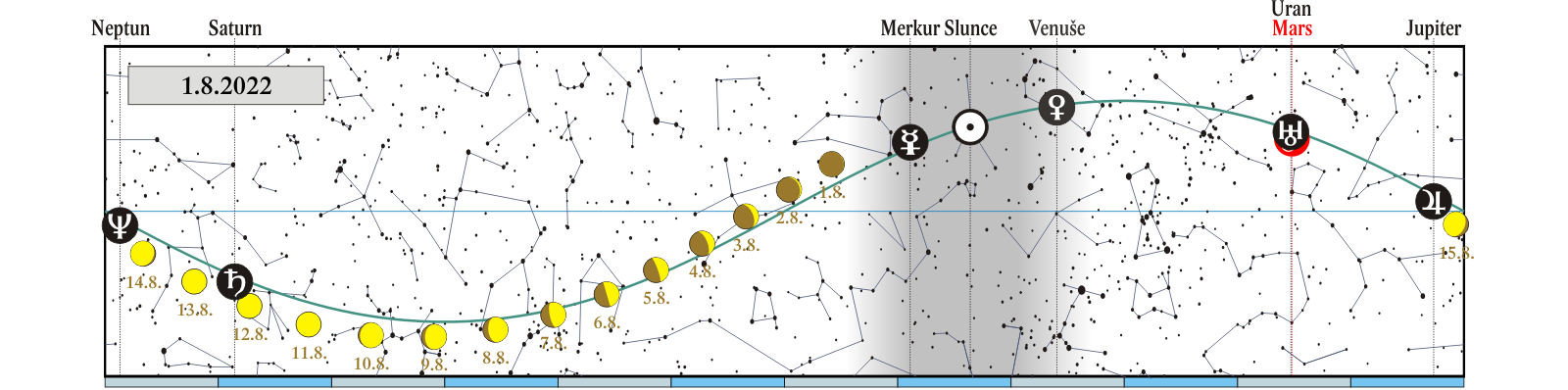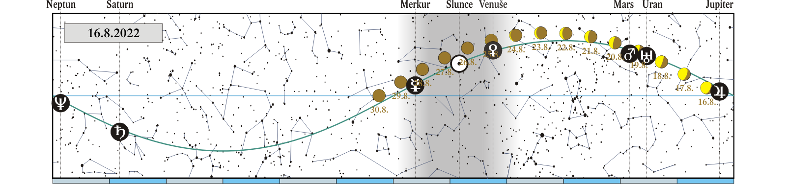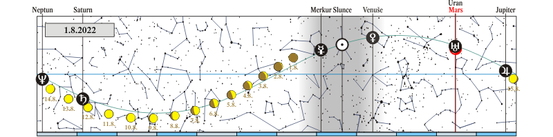 Mars v konjunkci s η Tau (Mars 5,53° jižně od Alcyone; 19. a 20. 8. seskupení Měsíce, Marsu, Plejád a Aldebaranu ve druhé polovině noci na východě) |