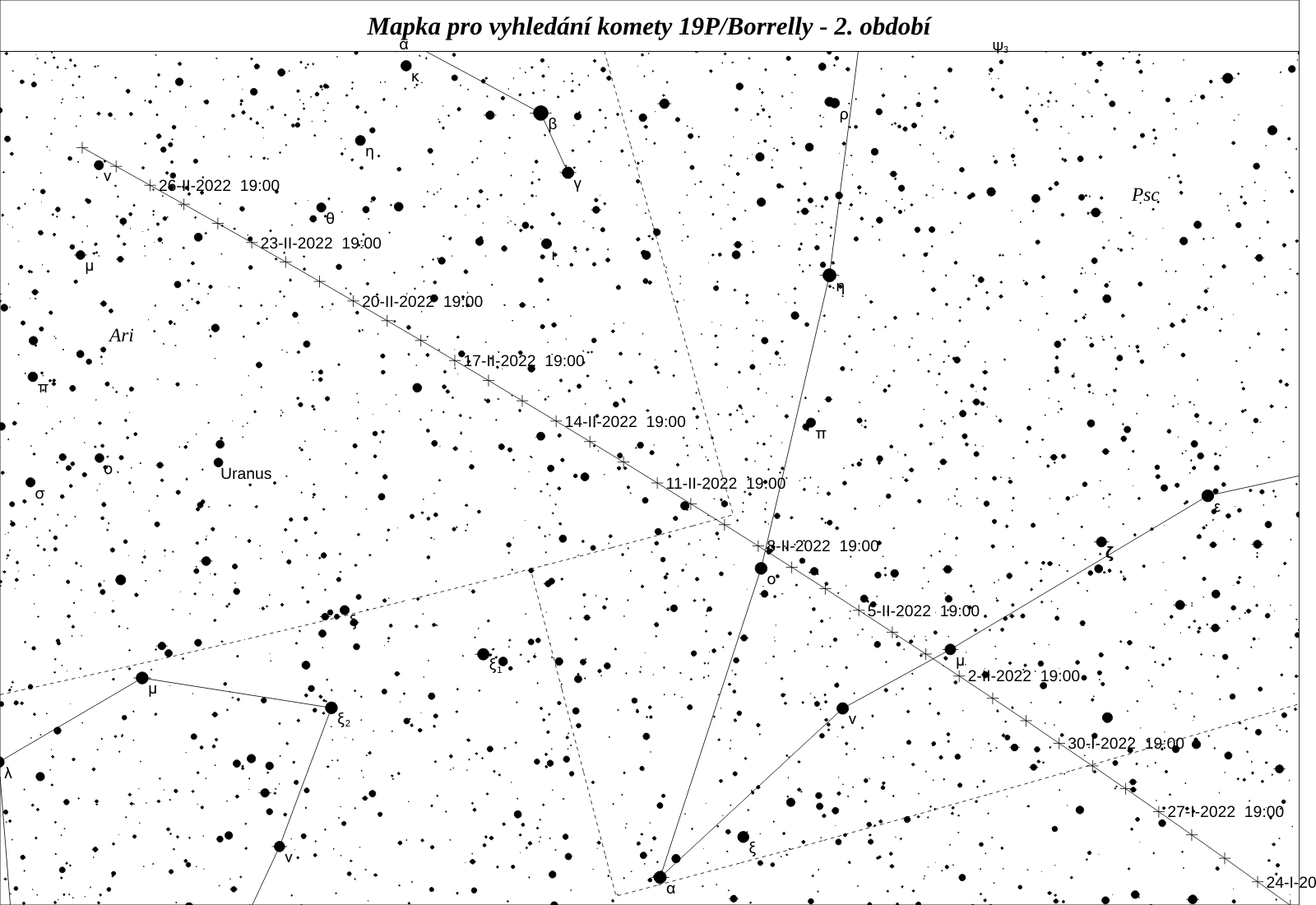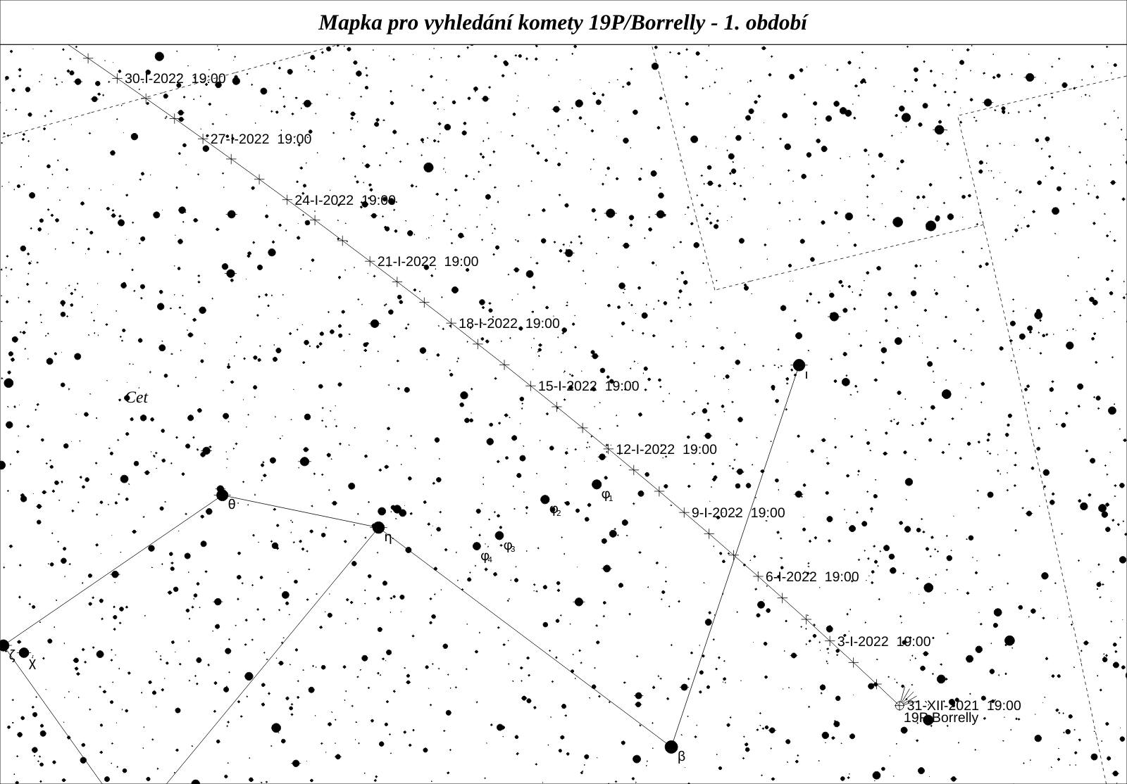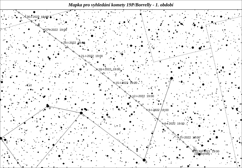 Poměrně známou kometou je 19P/Borrelly. V roce 1904 ji z Francie objevil Alphonse Louis Nicolas Borrelly. Kromě dvou návratů v letech 1939 a 1946 byla pozorována pravidelně v každém následném návratu. Jedná se o dosti aktivní kometu, kterou navštívila sonda Deep Space 1 a prozkoumala její jádro. To má velice nepravidelný tvar “burského oříšku” s jedním výrazným výtryskem materiálu z aktivní oblasti v polovině podlouhlého jádra. Její dráha je poměrně stabilní a nedochází k jejím výrazným změnám. Při letošním návratu bude u Slunce o 0,05 au blíže, než byla v předchozích pěti návratech, takže by mohla být mírně aktivnější. Poměrně pohodlně pozorovatelná, s jasností více než 14 mag, bude v celé první polovině roku. Maxima jasnosti okolo 9 mag dosáhne už v lednu.