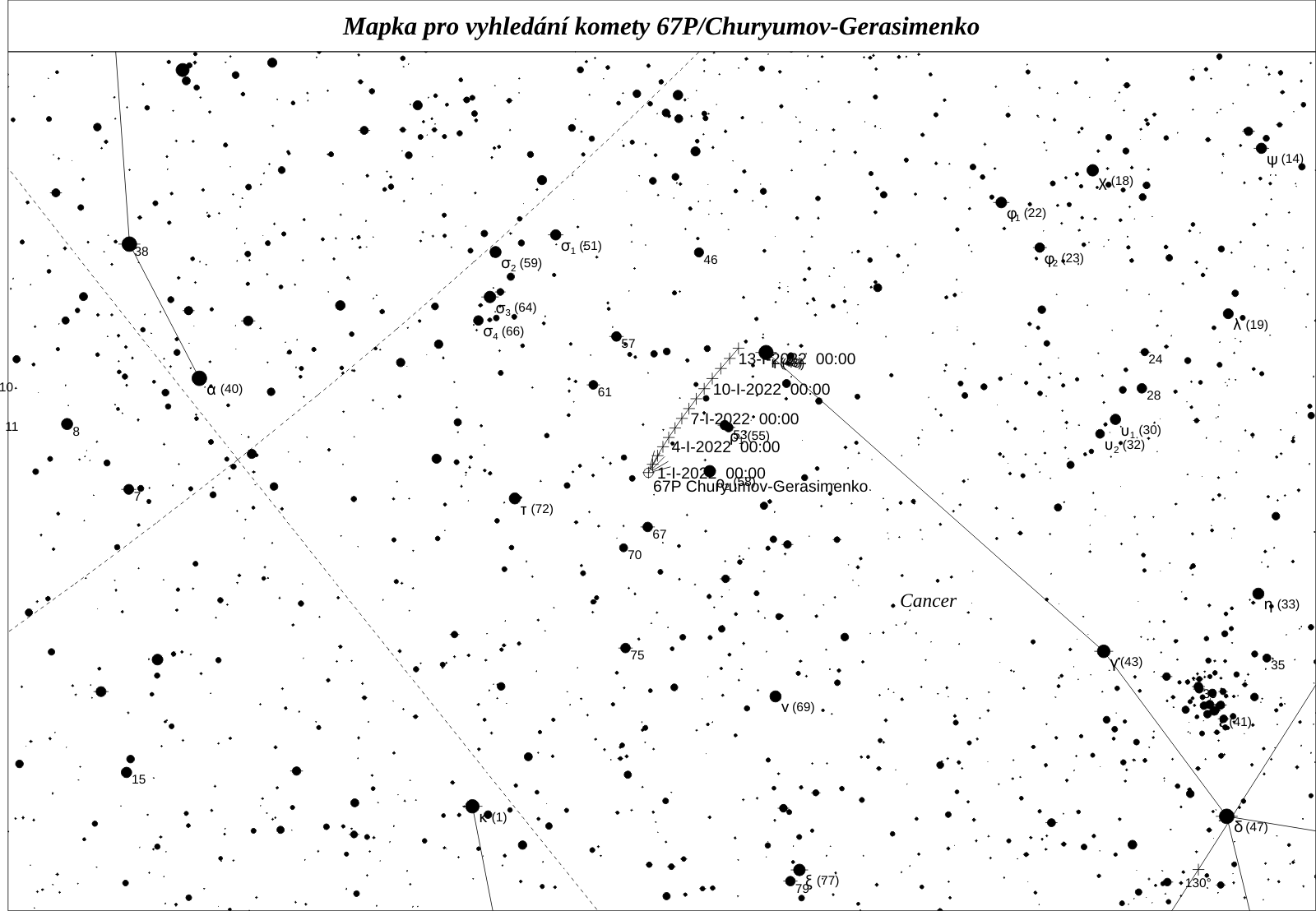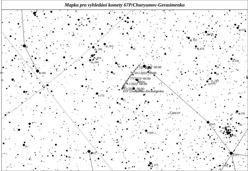 Asi nejlépe prozkoumanou kometou současnosti je 67P/Churyumov-Gerasimenko. Tu objevil v roce 1969 Klim Ivanovič Čurjumov a Světlana Ivanovna Gerasimenková. Tato kometa se stala cílem sondy ESA, Rosetta, a na povrchu jejího jádra přistál modul Philae. Ke kometě dorazila sonda v srpnu 2014 a jádro neustále monitorovala až do září roku 2016, kdy došlo k řízené kolizi s jeho povrchem. Jednalo se doposud o nejúspěšnější průzkumnou misi u komety v historii. Tato kometa byla původně na dráze s perihelem ve vzdálenosti více než 2,7 au, ale těsný průlet kolem Jupiteru v roce 1959 razantně přiblížil perihel na hodnoty kolem 1,3 au. Aktivace původně neaktivního jádra vedla k jejímu objevu. Dráha bude v tomto století stabilní a my se tak můžeme těšit na pravidelné návraty jasné komety viditelné malými dalekohledy. Kometa prošla perihelem už loni. Letos jí budeme moci pozorovat v lednu a její jasnost bude stále vysoká, bude se pohybovat kolem 10 mag.