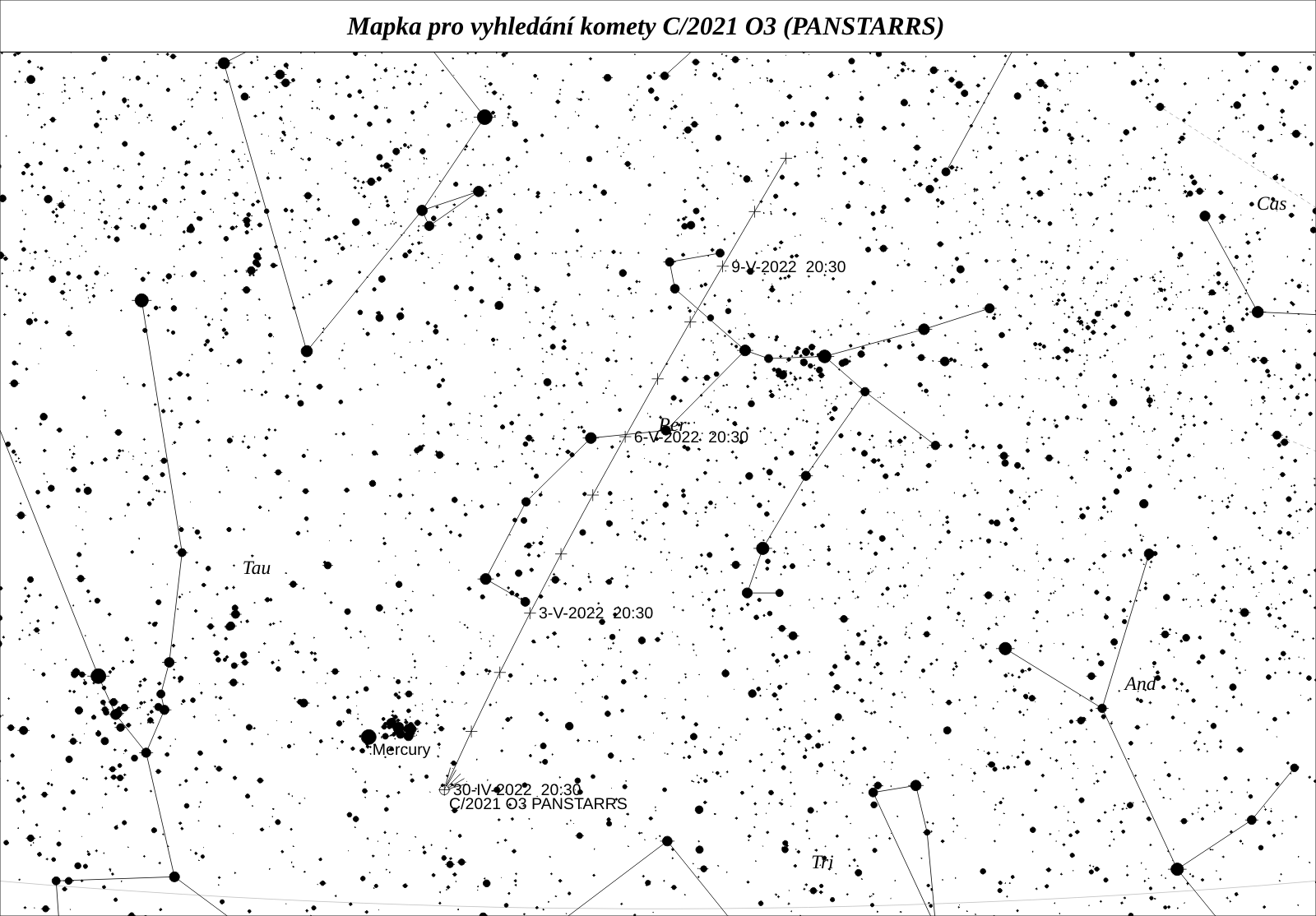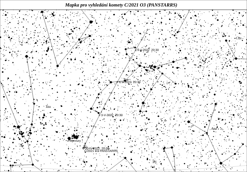 Velmi zajímavou kometou je C/2021 O3 (PANSTARRS). Jedná se o velmi malé těleso, jehož absolutní jasnost ho umisťuje pod “Bortleho limit pro přežití”. Zatím žádná kometa pod tímto limitem průlet kolem Slunce nepřežila. Ani v tomto případě nečekáme výjimku. Zanikající minikomety představují důležité objekty výzkumu. Jsou totiž kosmickými laboratořemi, v nichž poměrně přesně zjistíme hmotnost, poměrové složení i vnitřní strukturu jádra. Kolem Slunce patrně proletí ve vzdálenosti pouze 0,29 au, ale (bohužel pro nás) bude pozorovatelná až po průletu, kdy na dráze nejspíše už nebude aktivní těleso. Může ovšem překvapit, takže pro jistotu připojujeme mapku pro období těsně po průletu kolem Slunce.