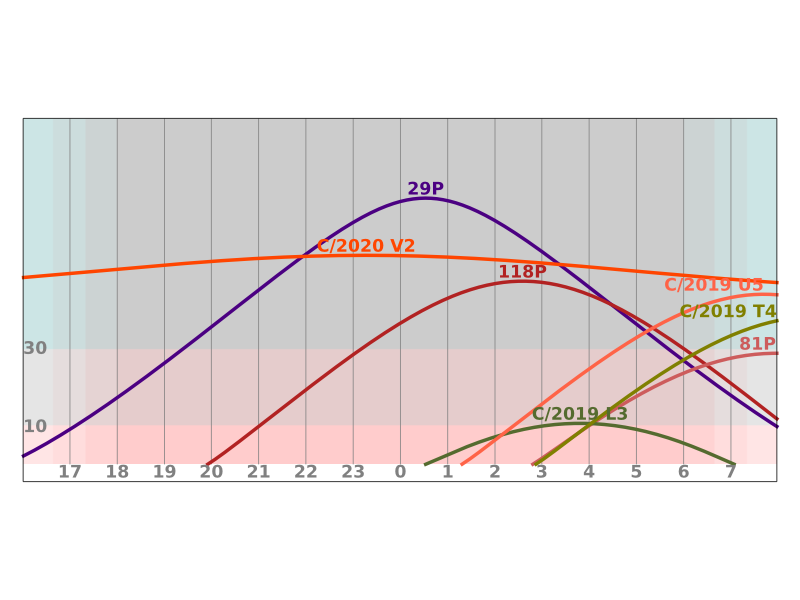 Hitem prosincové oblohy bude s jasností kolem 10 mag C/2020 V2 (ZTF), kterou spatříme po celou noc blízko Polárky. Okolo půlnoci bude v Blížencích kulminovat 29P/Schwassmann-Wachmann. 118P/Shoemaker-Levy zjasní lehce nad 12 mag a nalezneme ji v dobré poloze vysoko na obloze v Raku. Na ranní obloze se budou s klesající deklinací mírně horšit pozorovací podmínky 81P/Wild, bude mít ale stále jasnost okolo 11,5 mag a nalezneme ji v Panně. V té také nalezneme i C/2019 U5 (PANSTARRS), která poprvé prolomí jasnost 14 mag. Nedaleko v souhvězdí Vah bude s jasností 13 mag C/2019 T4 (ATLAS).