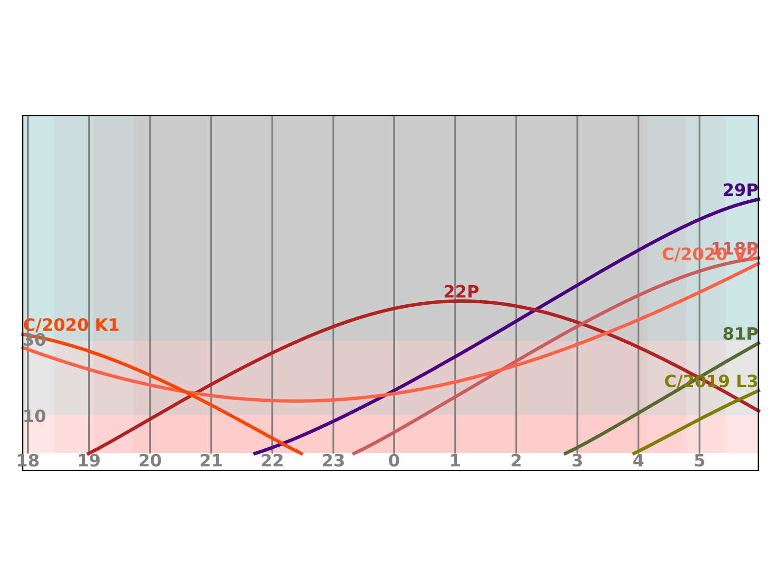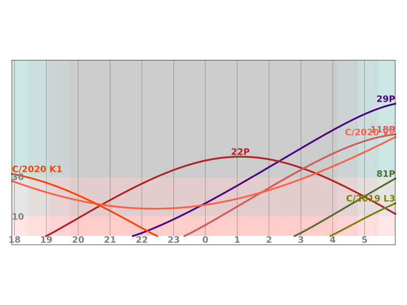 Na večerní obloze bude stále, i když za horších podmínek, pozorovatelná C/2020 K1 (PANSTARRS). Jako objekt 13 mag ji nalezneme opět v Hadonoši. Okolo půlnoci bude kulminovat 22P/Kopff, zeslábne na 13 mag a nalezneme ji ve Velrybě. Na ranní obloze budeme moci s jasností kolem 12 mag pozorovat C/2020 V2 (ZTF), opět ji nalezneme ve Velké medvědici. Na 13,5 mag zjasní 118P/Shoemaker-Levy, která se bude spolu s 29P/Schwassmann-Wachmann nacházet v Blížencích. Poprvé se na ranní obloze objeví kometa 81P/Wild, s jasností 12,5 mag ji nalezneme ve Lvu.