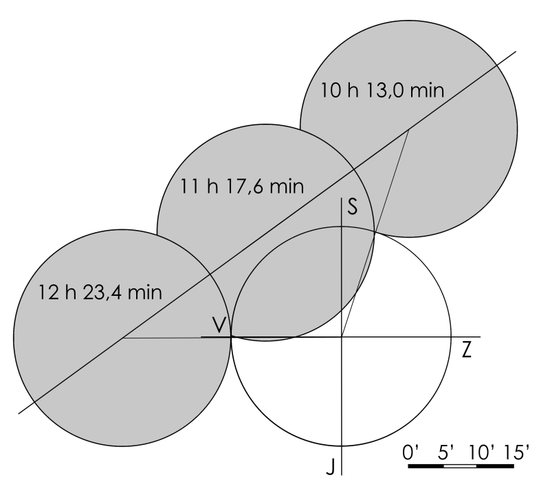 Schematický průběh částečného zatmění Slunce 25. října 2022 na 50° severní šířky a 15° východní délky. Sluneční kotouč má střed na průsečíku deklinační kružnice NS a rovnoběžky EW. Kotouč Měsíce je vyznačen šedou barvou a zakreslen postupně v okamžiku 1. kontaktu, maximální fáze a 4. kontaktu. Časové údaje jsou uvedeny v SEČ.