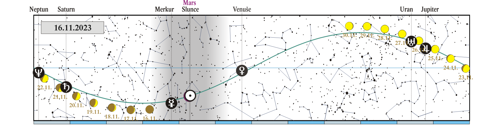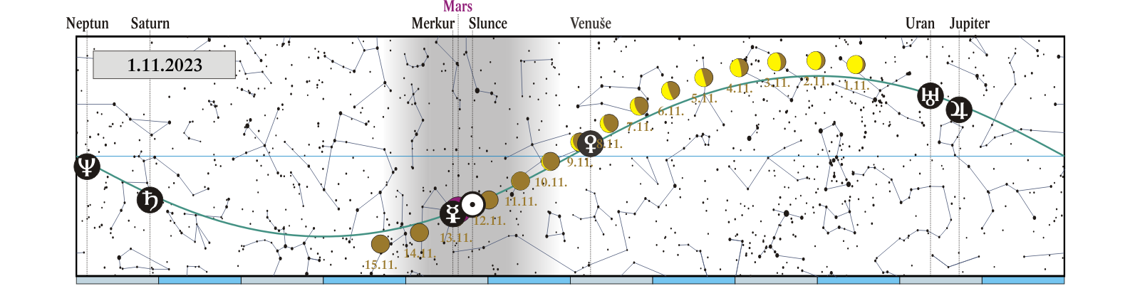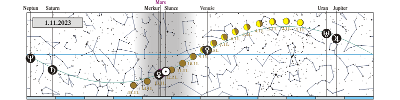 Měsíc v konjunkci s α Leo (Regulus 3,30° jižně; Měsíc u Regulu 7. 11. ráno nad V obzorem) |