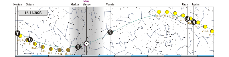 Měsíc v konjunkci s Jupiterem (Jupiter 1,68° jižně; seskupení Měsíce, Jupiteru, Aldebaranu a Plejád 25. až 27. 11. po celou noc) |